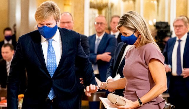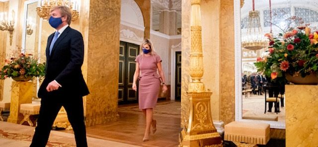 Lo que llamó la atención es el color de los barbijos o mascarillas que los soberanos de los Países Bajos utilizaron. Lejos del naranja característico, los tapabocas que Guillermo y Máxima se pusieron eran de color azul, en el tono bautizado como "azul Máxima".