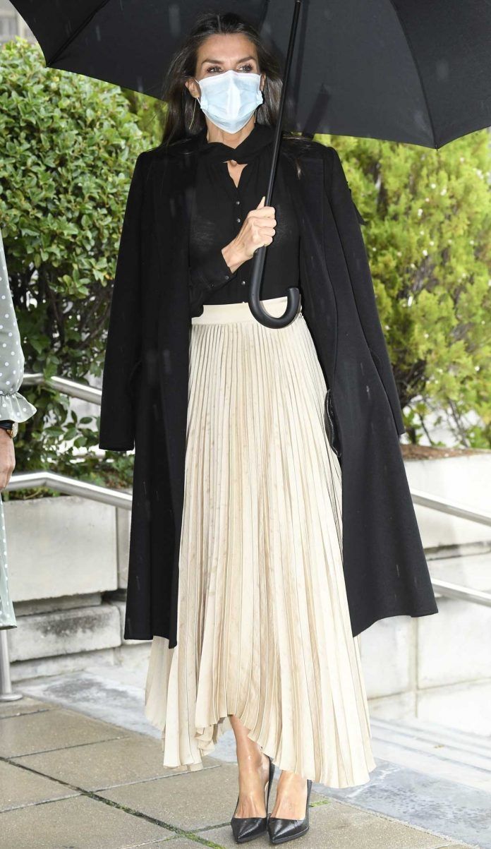 Finalmente la monarca se decantó por una falda plisada dorada y asimétrica by Massimo Dutti y una blusa negra. Fiel a la onda de la moda sustentable, que tiene como uno de sus preceptos el de reutilizar prendas, la reina se puso la misma falda en junio pasado, en una salida al teatro con su marido y sus hijas, Leonor y Sofía.