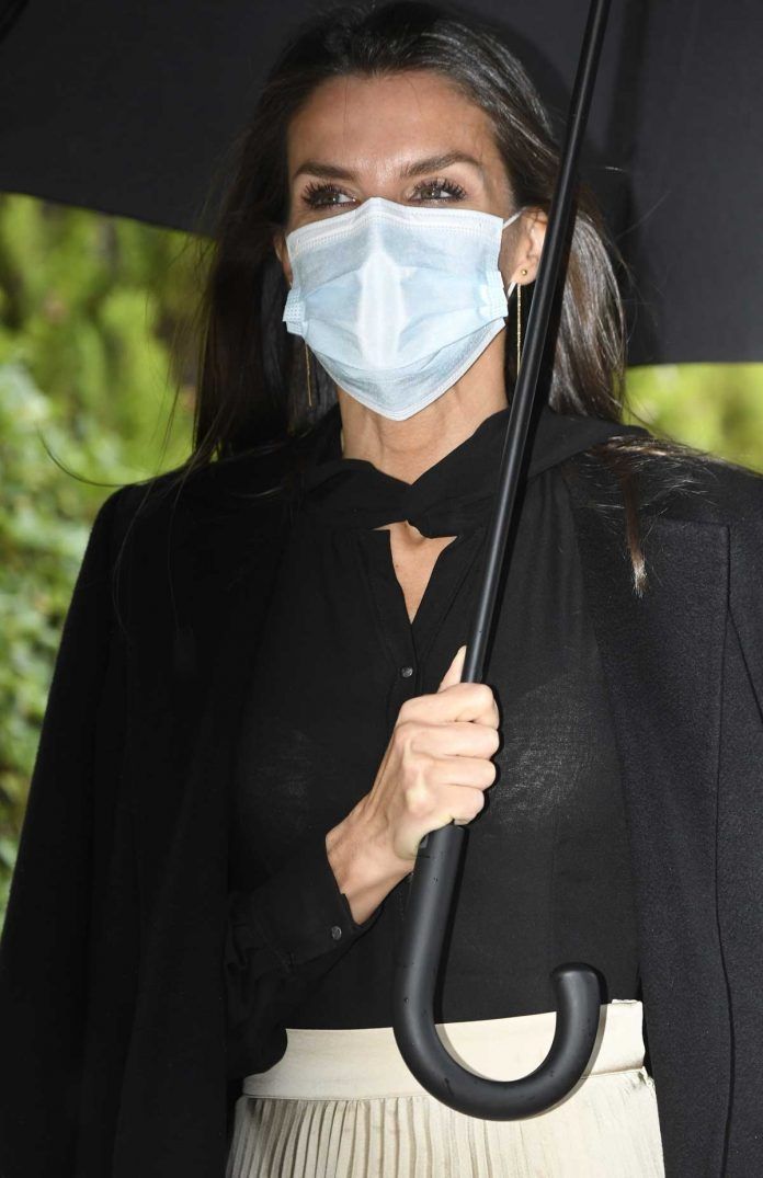 El día lluvioso en Madrid, al que se sumó muchísimo viento y el uso de paraguas obligado, no colaboró con la situación. La reina tuvo que mostrar una destreza especial para sostener el abrigo (de Carolina Herrera) sobre los hombros, el paraguas y la cartera en la otra mano (negra con filo dorado también de Carolina Herrera).
