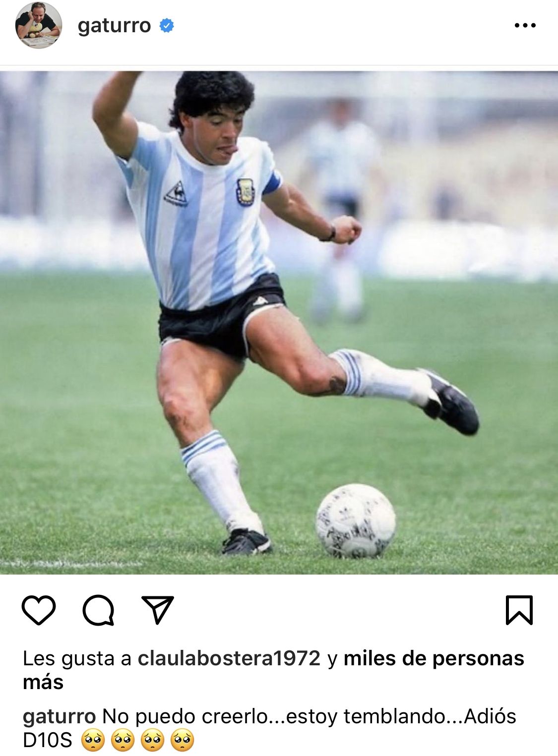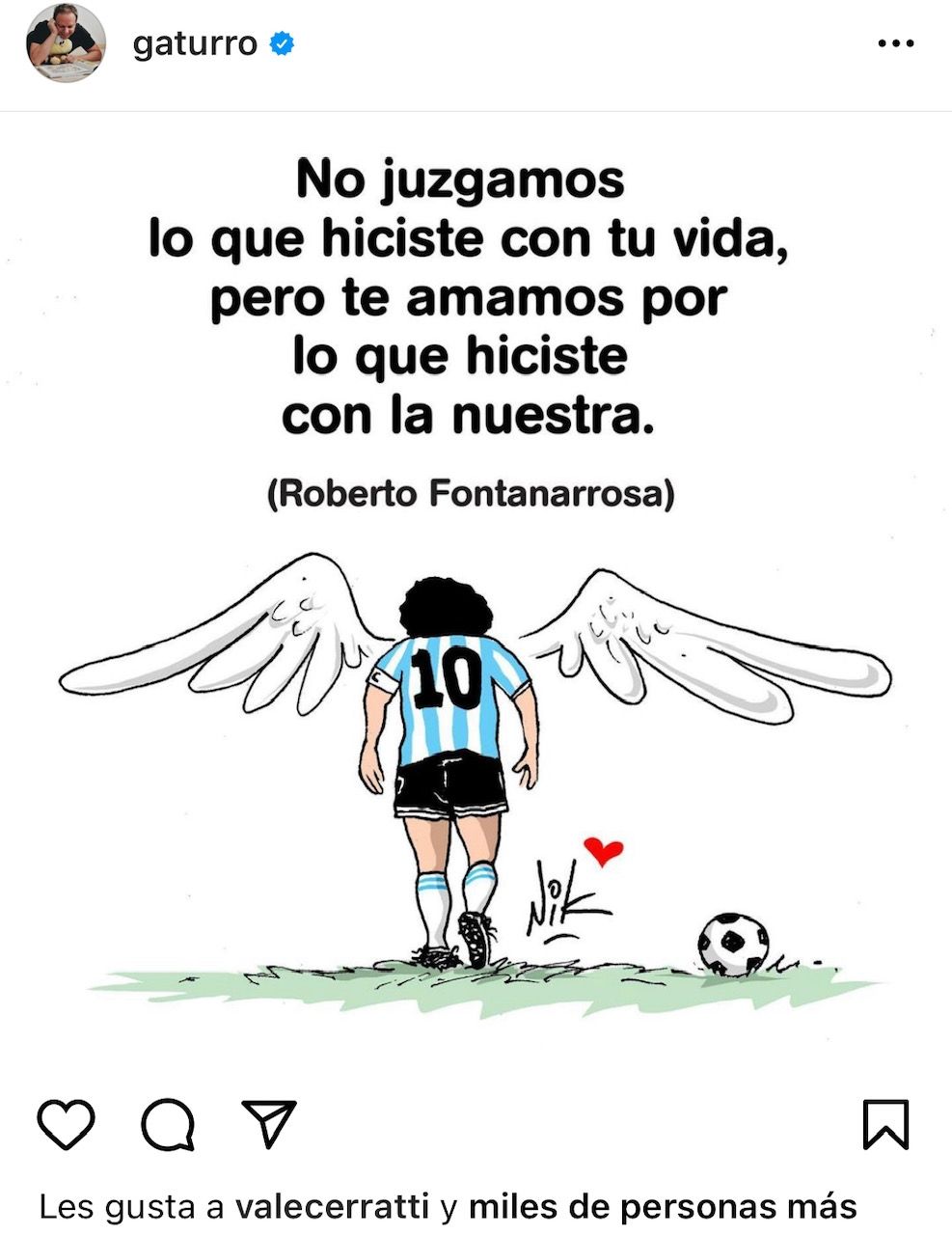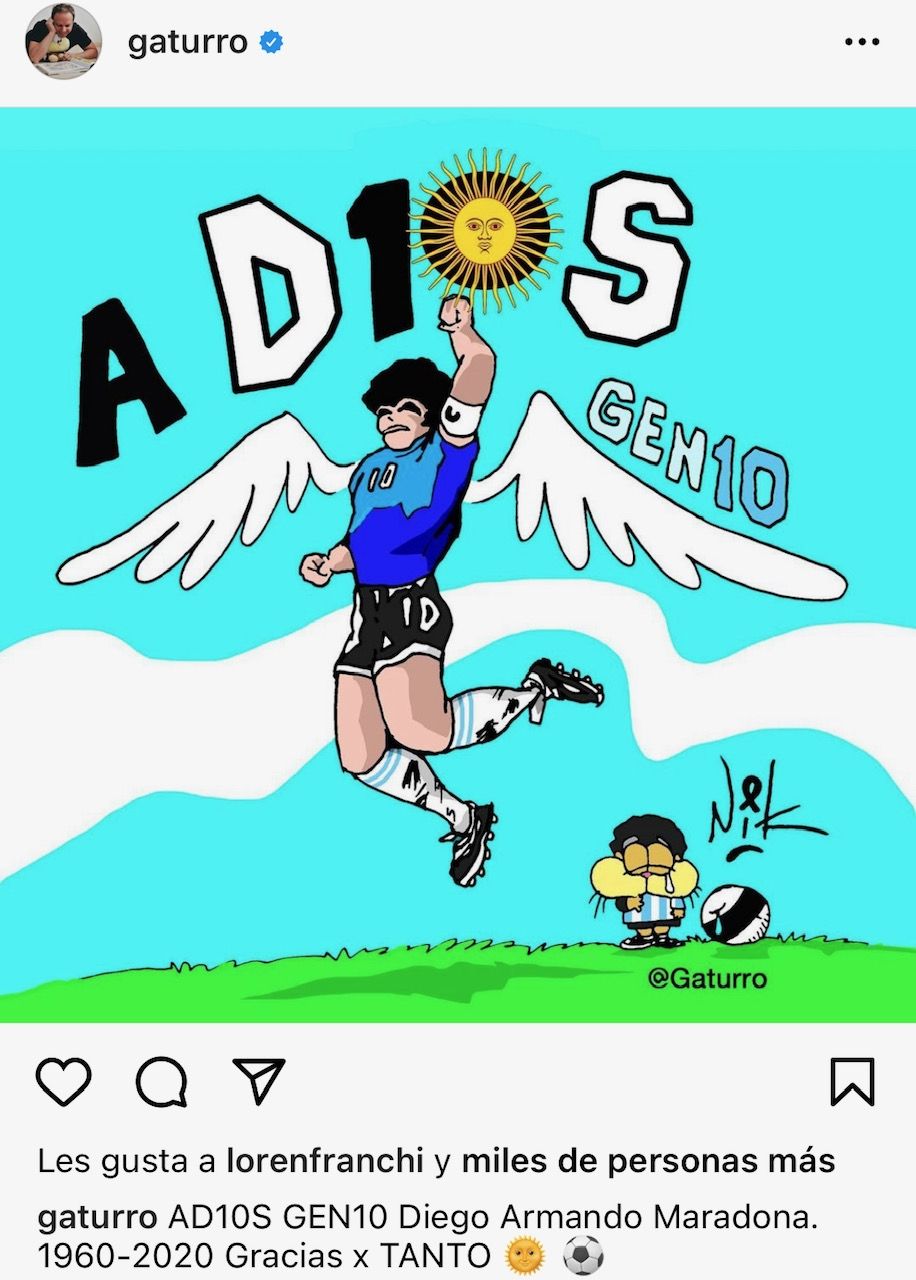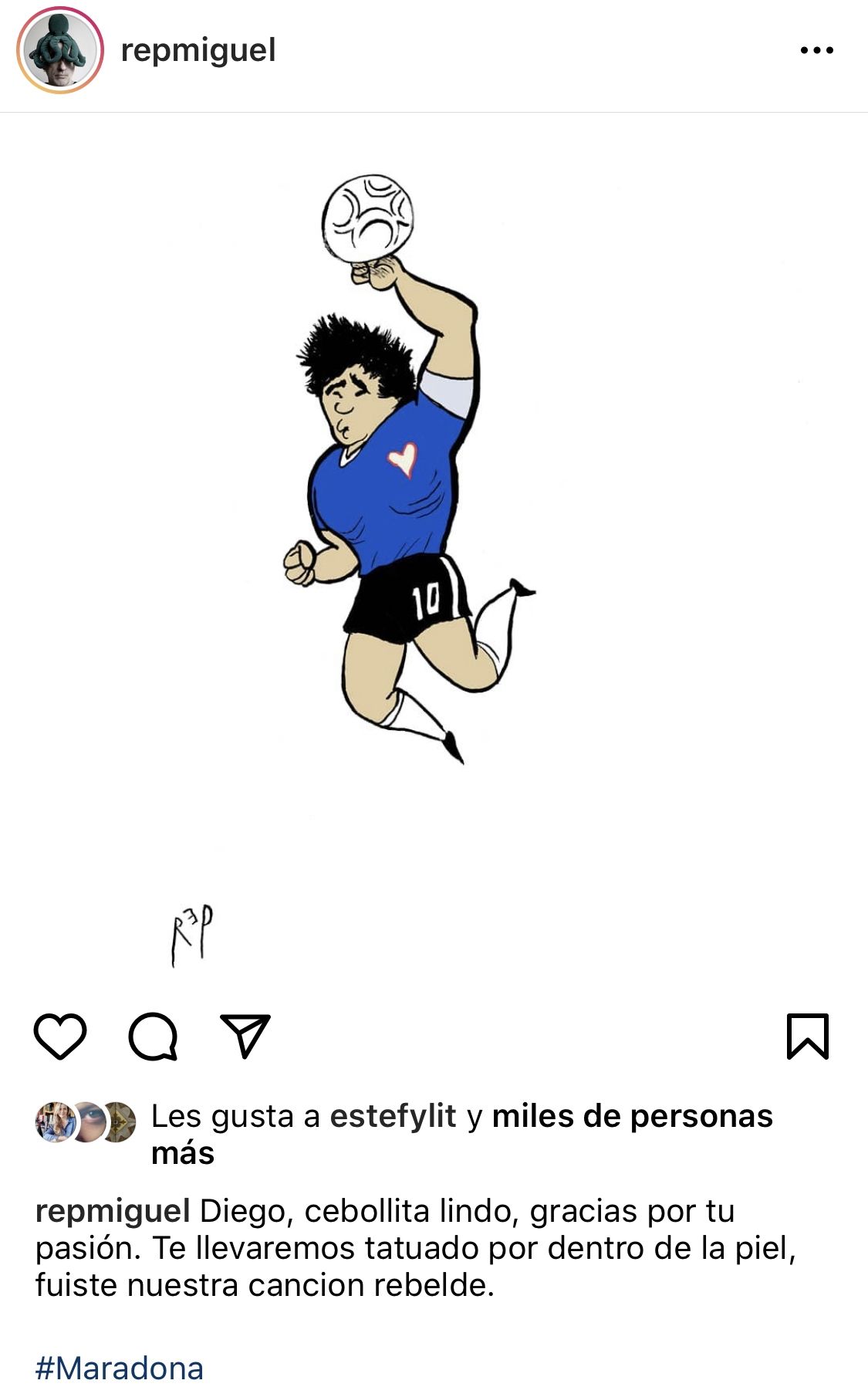Rep, para acompañar su dibujo, colocó un emocionante epígrafe: "Diego, cebollita lindo, gracias por tu pasión. Te llevaremos tatuado por dentro de la piel, fuiste nuestra canción rebelde".