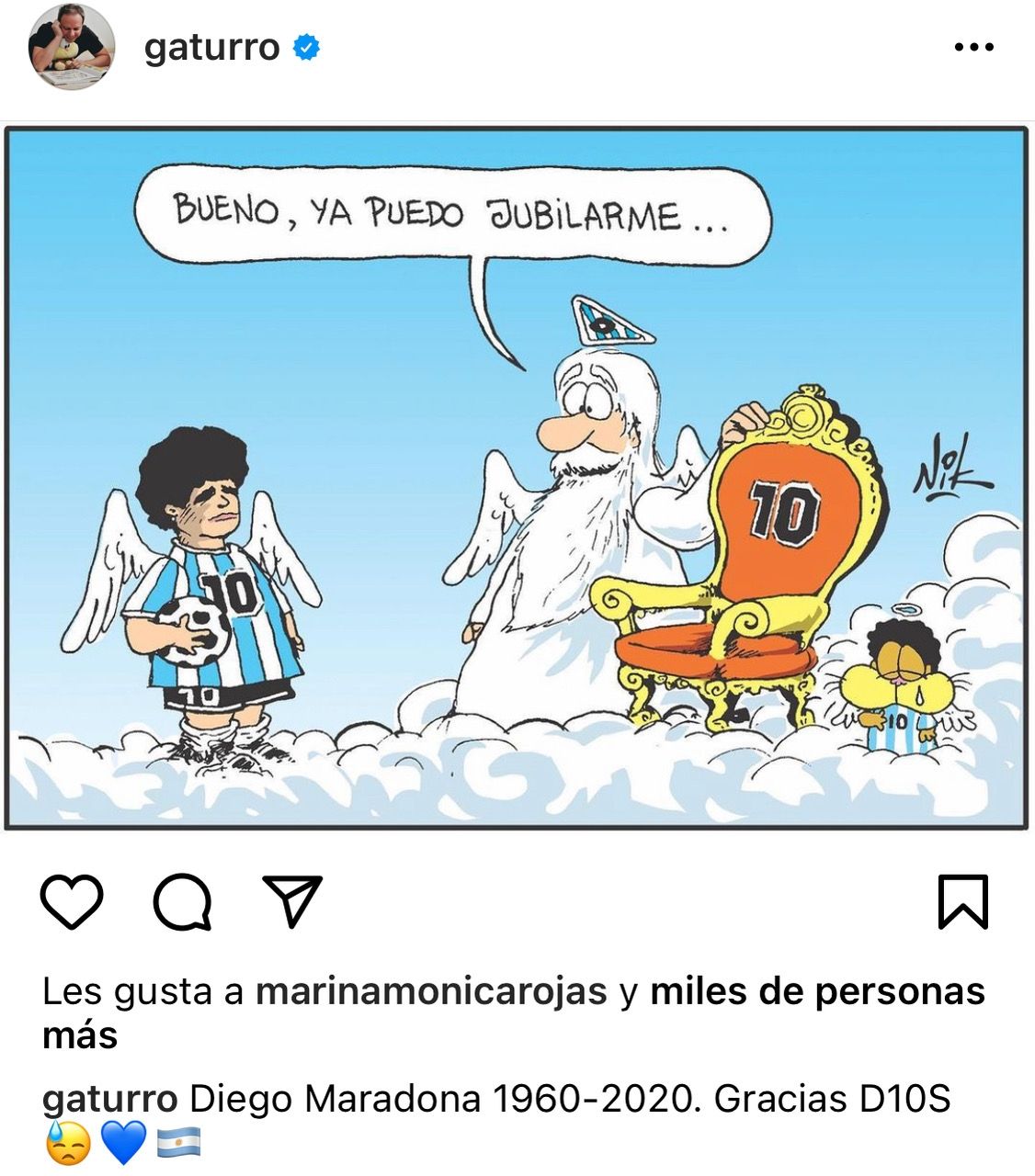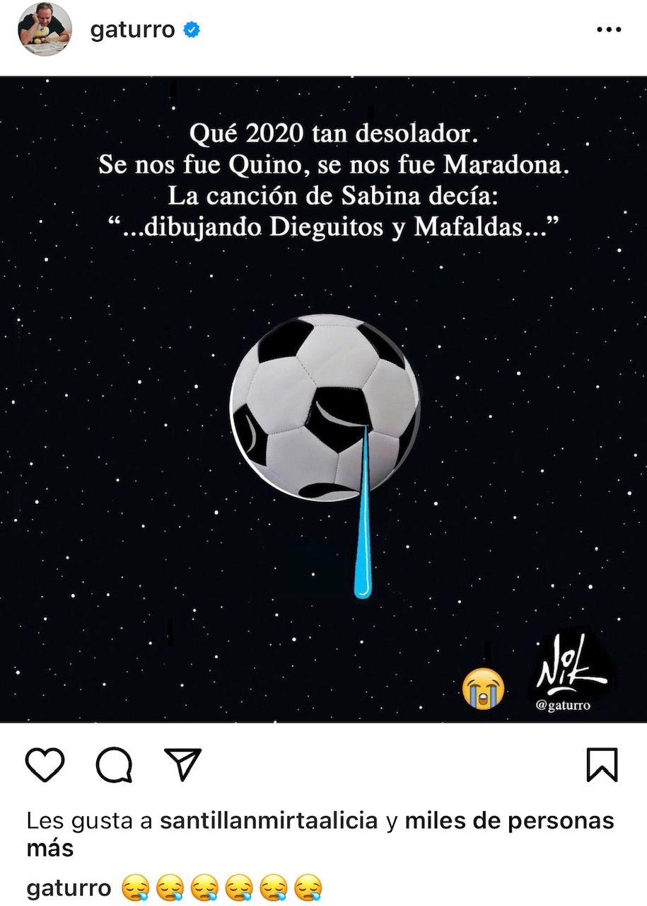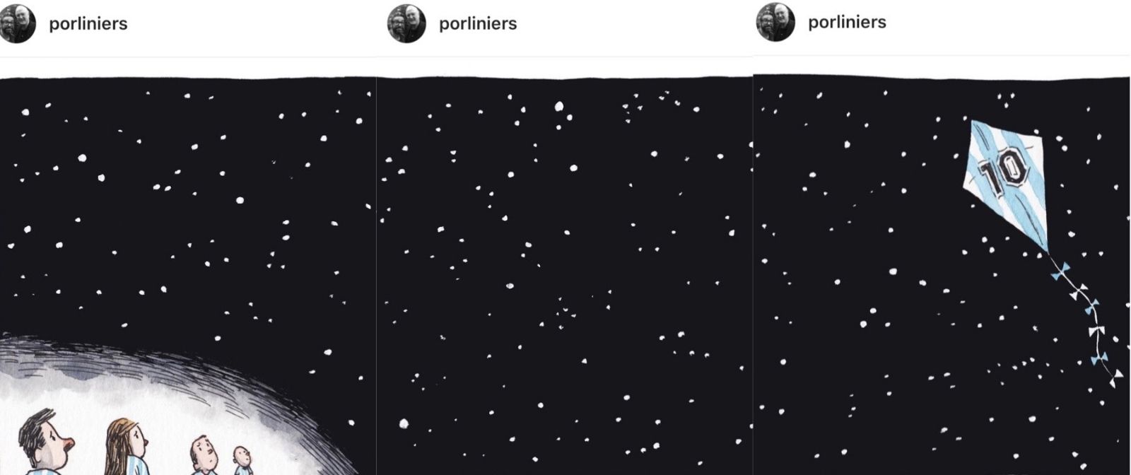 Liniers simplemente escribió el hashtag #Barriletecosmico para acompañar el dibujo de una cometa celeste y blanca y el número diez, danzando sobre un cielo estrellado. Claramente, recordando el impresionante relato que hizo Víctor Hugo Morales del catalogado "gol del siglo".