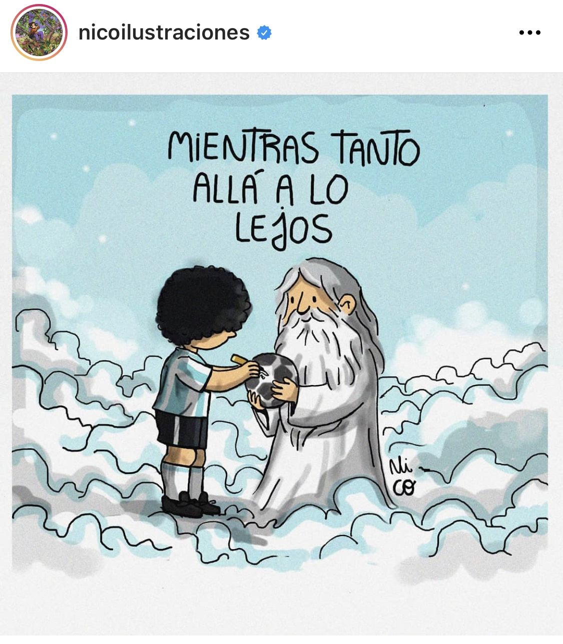 Nicolás Vilela, joven artista que es furor en las redes sociales, eligió imaginar un encuentro entre Diego Maradona y Dios, en el cual el todopoderoso le pide que le firme una pelota.