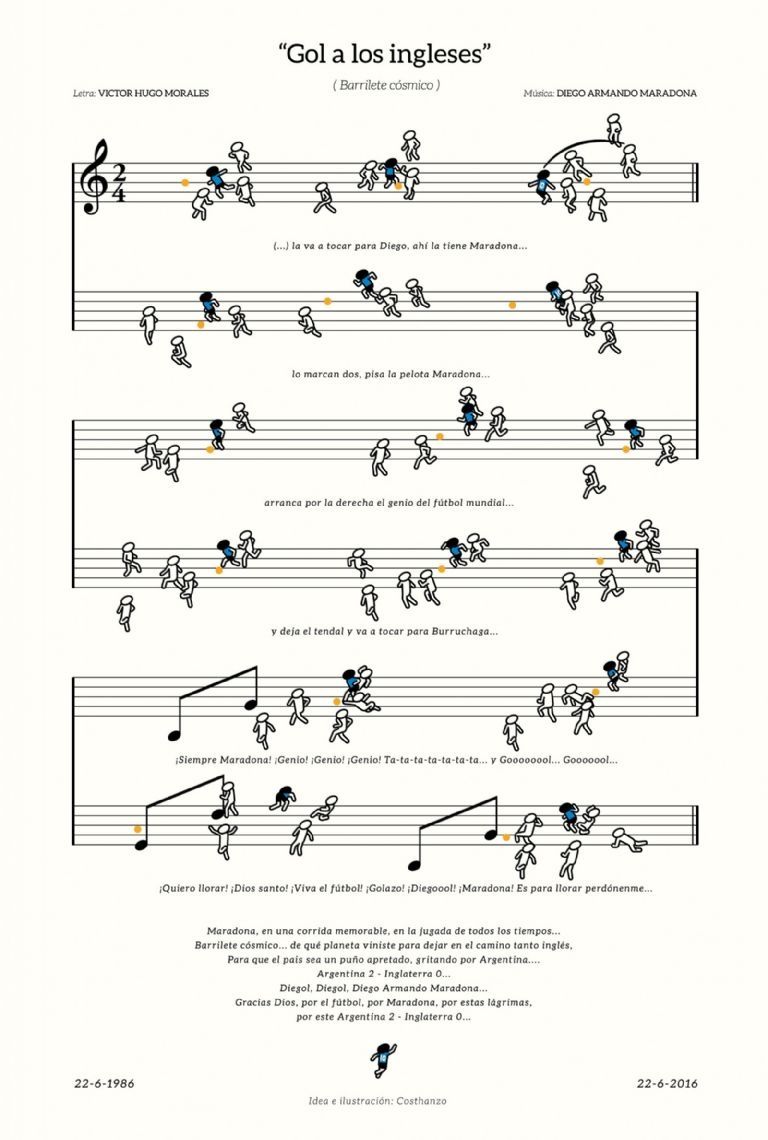 Costhanzo explicó que la noticia lo dejó sin aliento. "No puedo moverme", aseguró en Twitter. Decidio compartir un dibujo que había creado tiempo atrás que explica, a modo de partitura musical, el gol icónico.