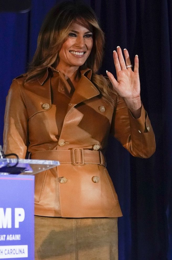 Pero en este cierre de campaña la Primera Dama tuvo especial protagonismo, no solo dejándose escuchar, sino además pertrechándose con abrigos y chaquetas de primera línea. Melania Trump, en Huntersville, sorprendió con una impresionante chaqueta de piel en color marrón de Ralph Lauren valorada en más de 5.000 euros.