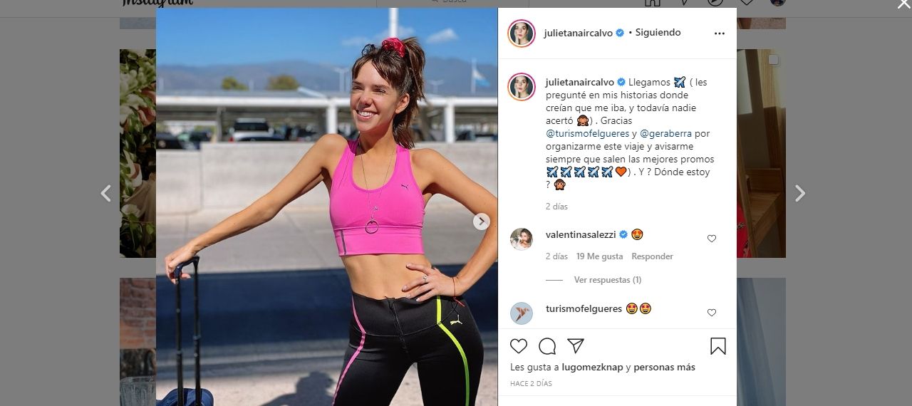 "Llegamos (les pregunté en mis historias donde creían que me iba, y todavía nadie acertó ) Gracias @turismofelgueres y @geraberra por organizarme este viaje y avisarme siempre que salen las mejores promos. Y ? Dónde estoy", posteó la joven en el Aeropuerto Internacional El Plumerillo.