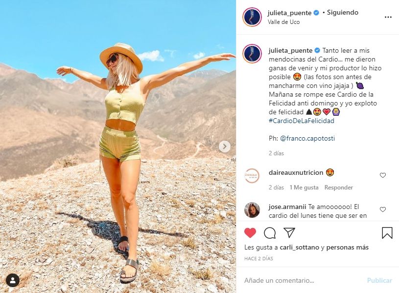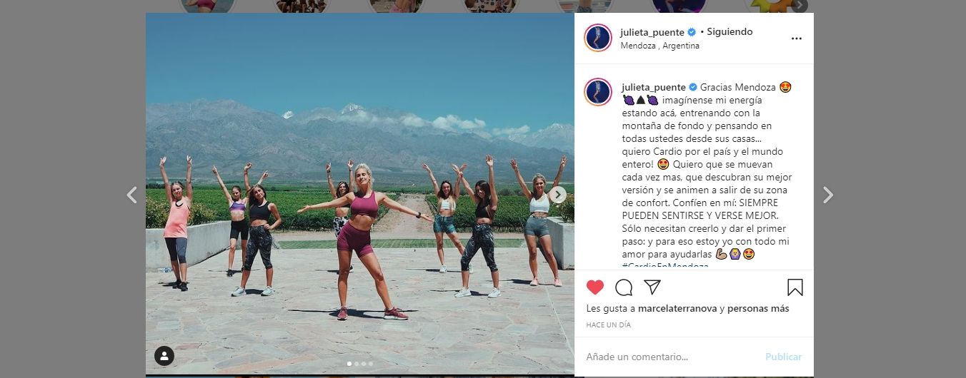 "Gracias Mendoza. Imagínense mi energía estando acá, entrenando con la montaña de fondo y pensando en todas ustedes desde sus casas. Quiero cardio por el país y el mundo entero. Quiero que se muevan cada vez más, que descubran su mejor versión y se animen a salir de su zona de confort. Confíen en mí: siempre pueden sentirse y verse mejor. Sólo necesitan creerlo y dar el primer paso: y para eso estoy yo con todo mi amor para ayudarlas", escribió Julieta Puente, la comunicadora social que revolucionó las redes sociales, a partir de la cuarentena, con el famoso cardio de la felicidad y quien actualmente está girando el país para llevar su energía a cada ciudad.