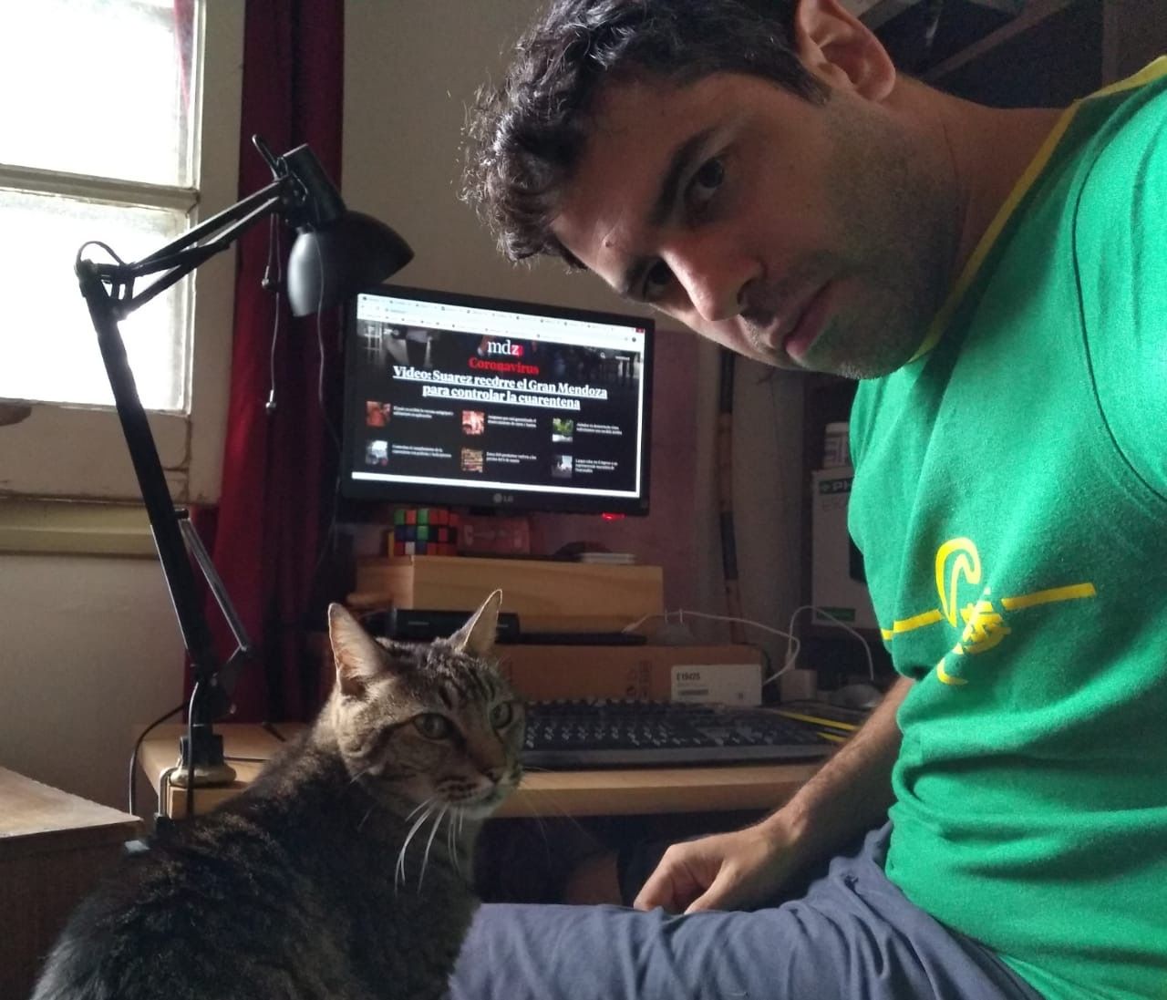 "Si bien mi trabajo como editor es el cierre del diario en la noche, desde la mañana temprano chequeando la información local, nacional e internacional en este contexto poco usual. Desde el hogar, con compañía felina a todo momento, buscando informar lo que sucede a cada minuto. #AislamientoObligatorio" (Federico Lemos - Editor de MDZ)