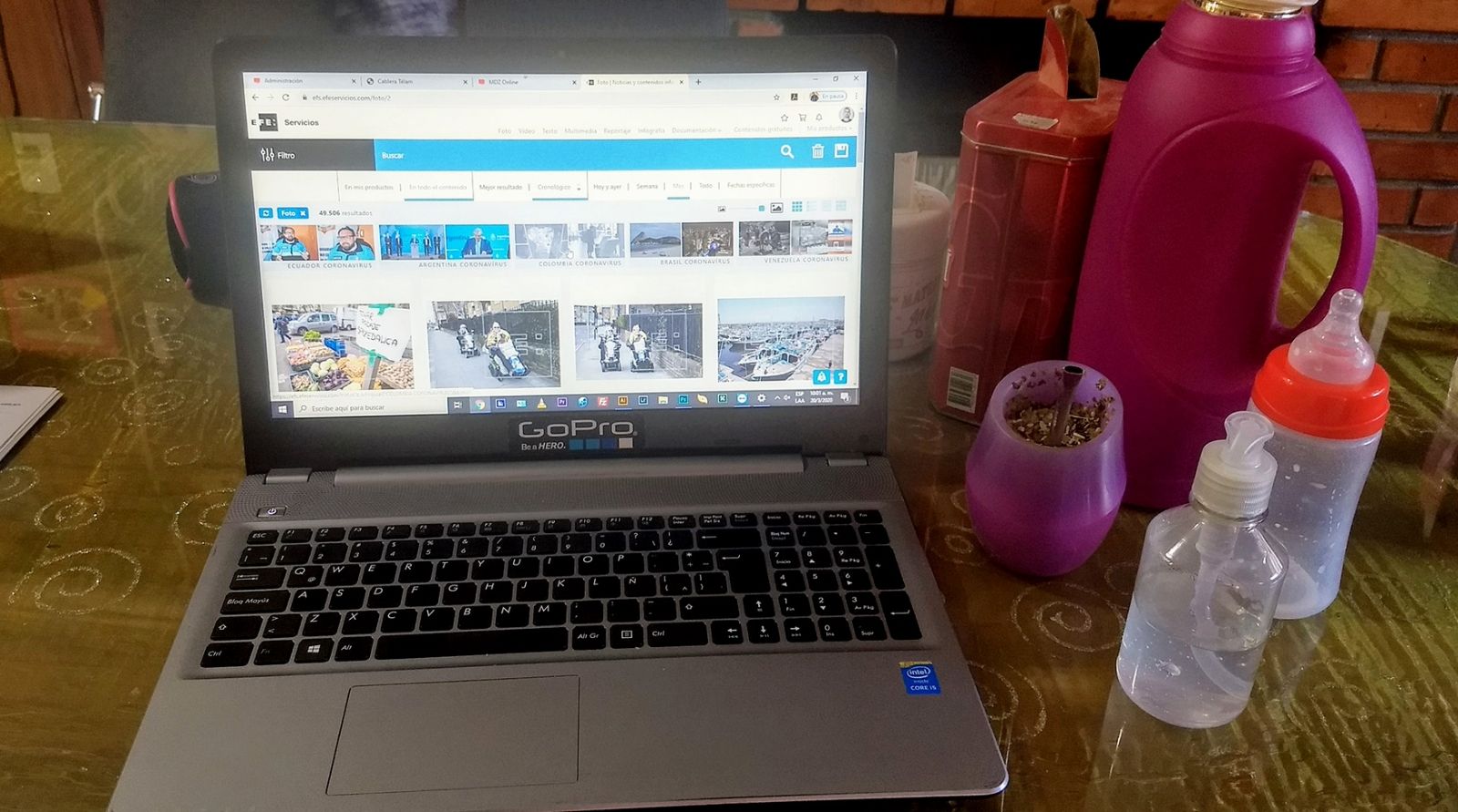 "Teniendo en cuenta que ya estamos 'aislados' desde el lunes -ya que mi hija es parte del grupo de alto riesgo- nos hemos ido acostumbrando a este tipo de mañanas. La compu nunca se apaga: las páginas de las agencias de noticias siempre abiertas, el sitio interno del diario donde vamos subiendo contenido...y entre foto y foto que subo, sale una mamadera o una ayuda para mi hijo que está haciendo las tareas de la escuela" (Pachy Reinoso, fotógrafo).