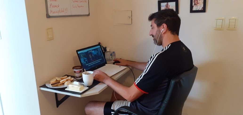 "Si bien en el último tiempo, por distintas actividades, me ha tocado trabajar mucho desde casa, 'mudar' la redacción a mi espacio personal es todo un desafío. La intensidad, la responsabilidad y la concentración que requiere informar en tiempos de coronavirus se afronta, en mi caso, con el mate, el pan con manteca y con las demandas de mi hijo de 2 años, por supuesto. De todas maneras, poder cumplir con el deber de informar y, paralelamente, compartir tiempo en familia, no deja de ser altamente gratificante". (Juan Andrés Tuzzi - Editor)