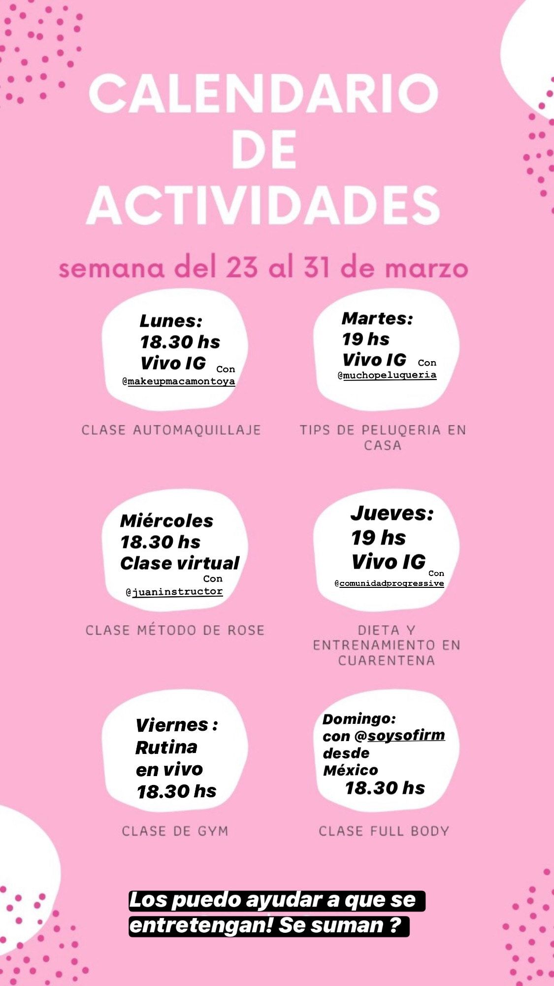 Pos su parte Chila Pérez anunció en su cuenta de Instagram: "Los invitó a todos los que quieran hacer una clase en vivo. Lunes 23 de marzo a las 19 horas. Fíjate los elementos. Todos los tenemos en casa. ¡Vamos a movernos juntos!", dijo Chila.
