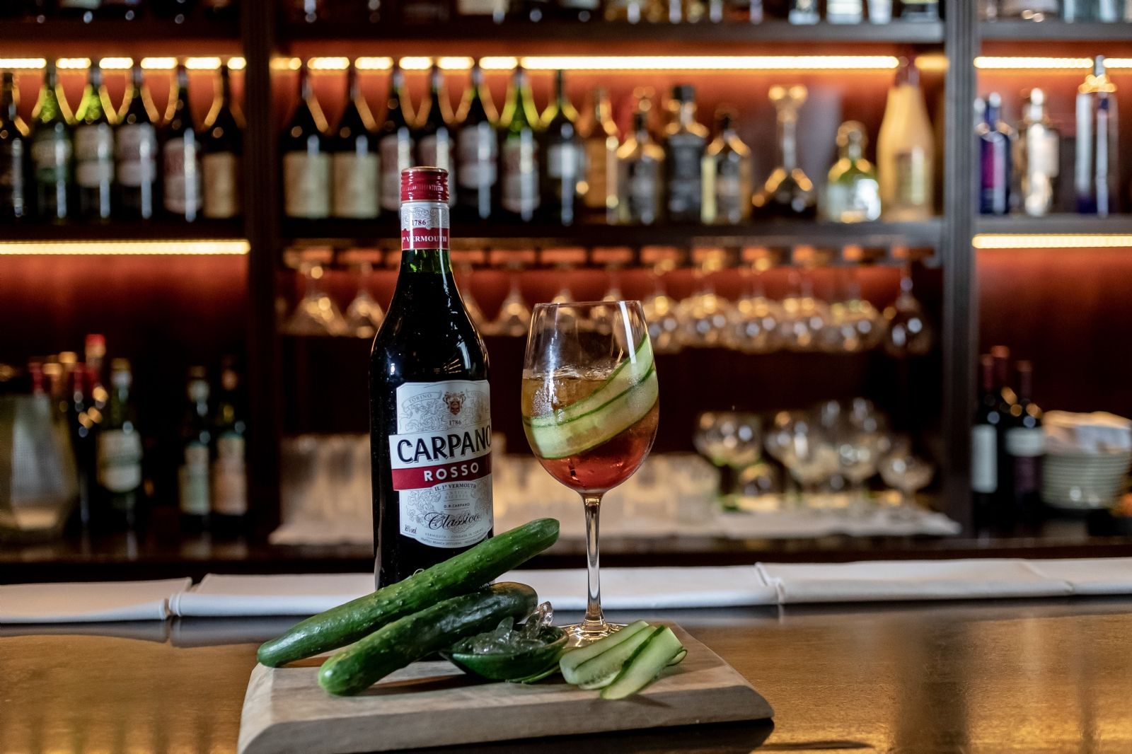 Colocar hielo en un copón de vino. Colocar el gin, el Carpano Rosso y la gaseosa lima limón. Mezclar todos los ingredientes con la ayuda de una cuchara. Decorar con una rodaja fina de pepino.