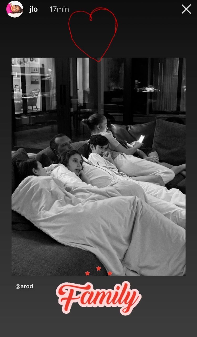 En la foto que publicó hace minutos en su historia de Instagram, JLo chequea plácidamente su celular y tuitea mientras tiene a uno de sus pequeños en brazos, mientras comparte un enorme sillón con otro de sus hijos, su novio y las dos hijas de Él; tapándose con un gran acolchado y disfrutando del porgrama "World of dance", en el que la diva participa.