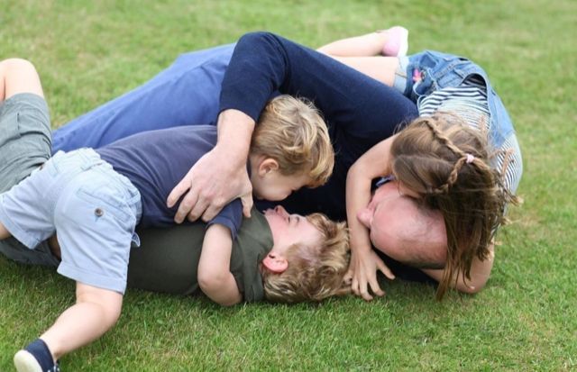 En otra foto, se ve a William acostado en pasto, jugando con sus tres hijos, quienes muy divertidos, se se abalanzan sobre él.
