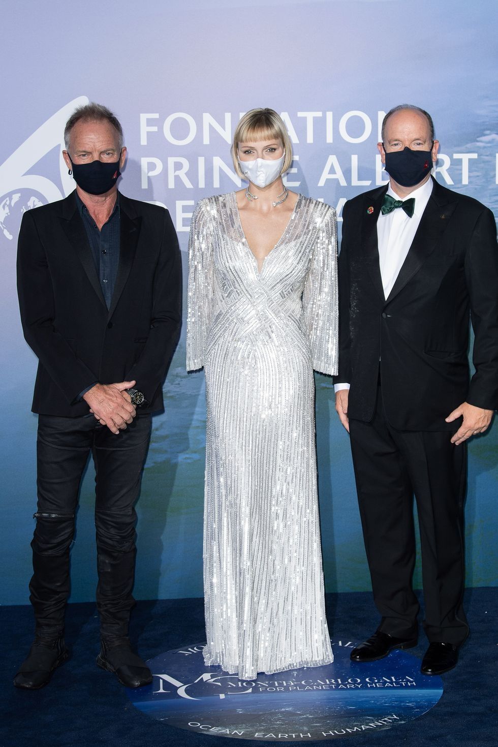 Charlene de Mónaco. Usó un espectacular vestido de lentejuelas de Jenny Packham. Agregó una mascarilla también plateada.