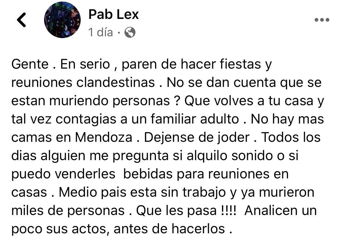 "Gente . En serio , paren de hacer fiestas y reuniones clandestinas . No se dan cuenta que se están muriendo personas ? Que volvés a tu casa y tal vez contagias a un familiar adulto . No hay mas camas en Mendoza . Déjense de joder . Todos los días alguien me pregunta si alquilo sonido o si puedo venderles bebidas para reuniones en casas . Medio país esta sin trabajo y ya murieron miles de personas . Que les pasa !!!! Analicen un poco sus actos, antes de hacerlos", puso en su muro de Faebook.