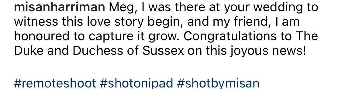 Harriman publicó la imagen en su cuenta de Instagram, y escribió: "Meg, estuve allí en tu boda para presenciar el comienzo de esta historia de amor, y amiga mío, me siento honrado de capturarla creciendo. ¡Felicitaciones al duque y la duquesa de Sussex por estas felices noticias!".