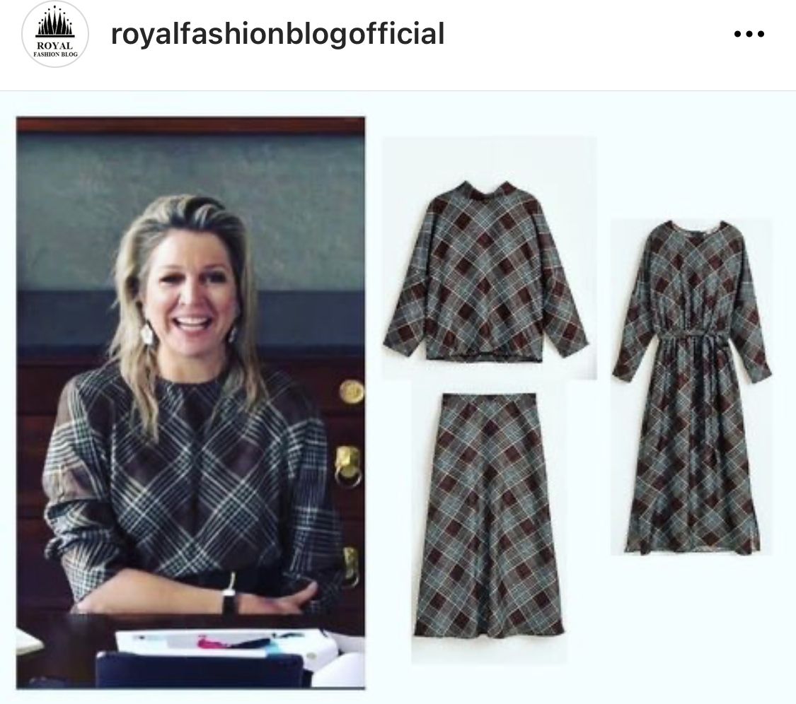 Desde el sitio de Instagram "Royal fashion blog" se compartió un detalle del atuendo que muchas holandesas dijeron "amar". Para la visita digital, la reina Máxima lució un vestido de seda a cuadros de Natan Naboo. Este mismo posee una variante, ya que también está la opción de comprarlo en dos piezas.