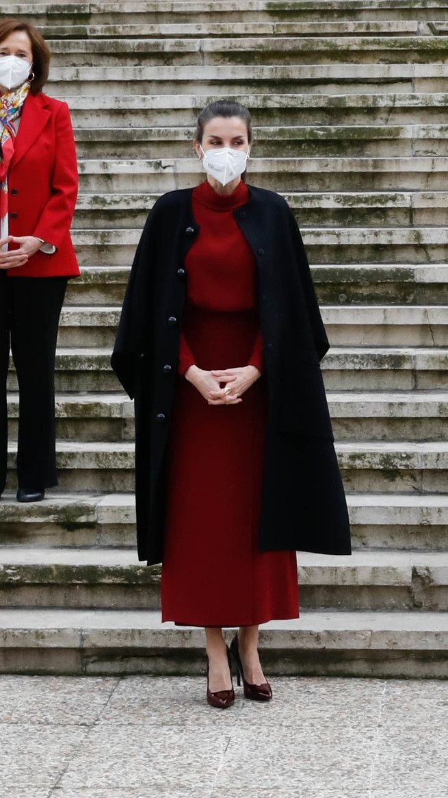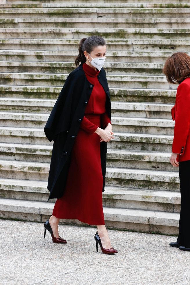 Se trató de un vestido de color granate con cuello perkins y de silueta relajada que lo combinó con un abrigo de color negro y grandes botones. Al mismo lo llevó sobre los hombros. Además optó por unos zapatos degradados de negro a burdeos de altísimo tacón.