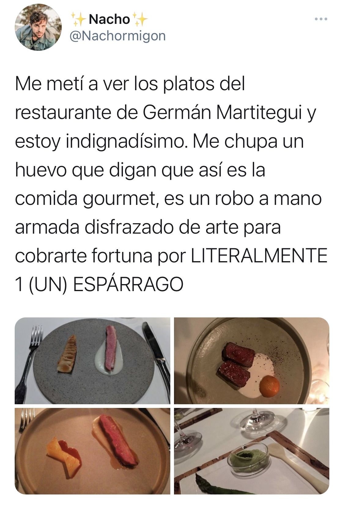 "Me metí a ver los platos del restaurante de Germán Martitegui y estoy indignadísimo. Me chupa un huevo que digan que así es la comida gourmet, es un robo a mano armada disfrazado de arte para cobrarte fortuna por LITERALMENTE 1 (UN) ESPÁRRAGO", dice el tuit que ya tiene miles de retuits, decenas de miles de "me gusta", y que ha producido una discusión impresionante entre los que lo secundan y los que han salido en defensa del chef.