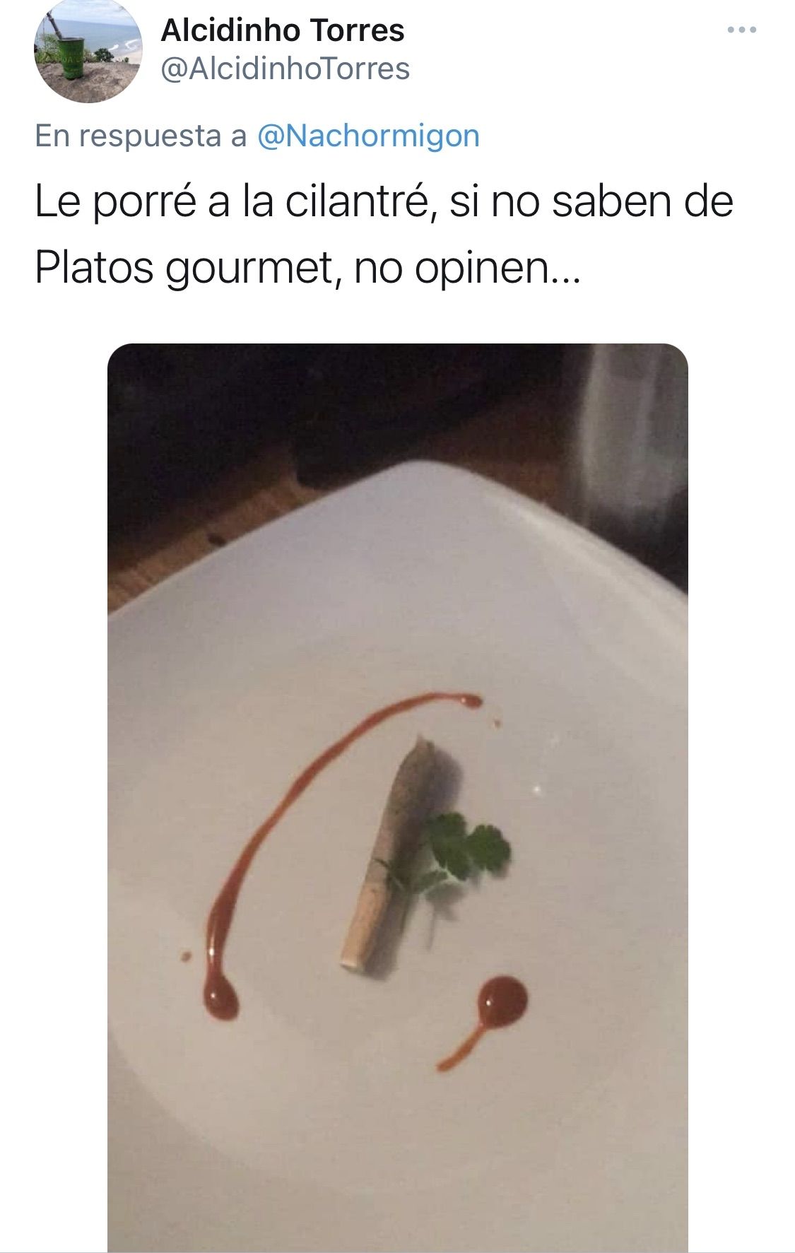 El "plato del espárrago" en cuestión fue el que, según el polémico tuit, el que rebalsó el vaso del usuario. Algunos de los que han respondido este tuit buscaron posturas más diplomáticas, como @Nachooopl, quien opinó que "lo referente a la comida es muy personal. A mi no me gustan los platos "abundantes" ni la cultura de comer a reventar. Prefiero algo bien hecho y no salir rodando. No hay que enojarse ni con Tegui ni con el bodegón "cachito", hay lugares para todos y eso es muy bueno".