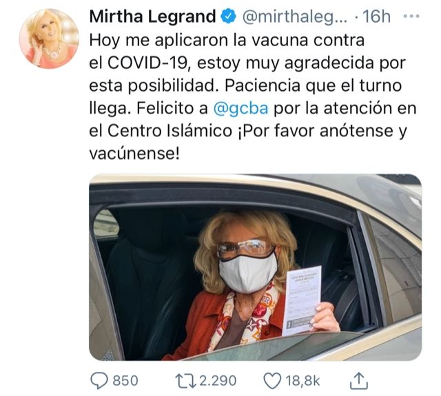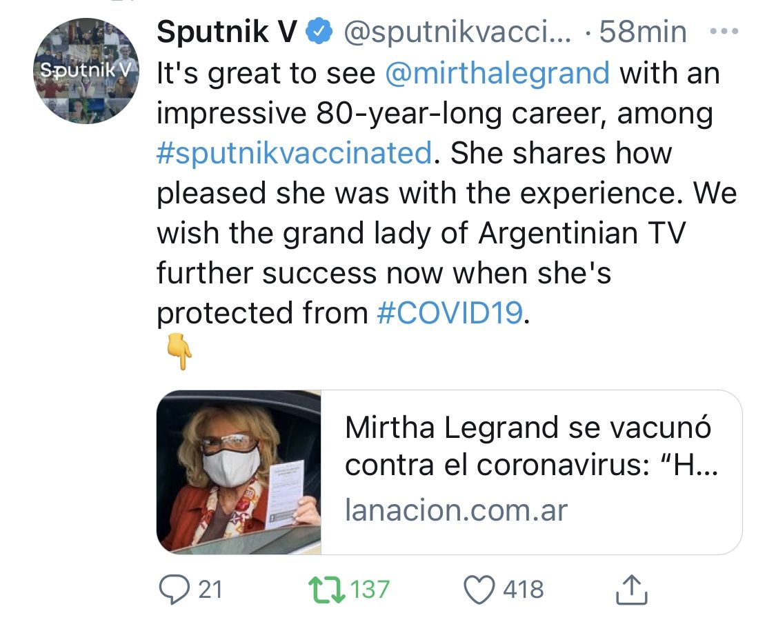 "Es genial ver a Mirtha Legrand, una mujer que tiene una impresionante carrera de 80 años, entre los vacunados con Sputnik. Ella ha compartido lo complacida que se sintió con la experiencia. Le deseamos a la gran dama de la televisión Argentina aún más éxito, ahora que está protegida del Covid-19", dice el tuit.