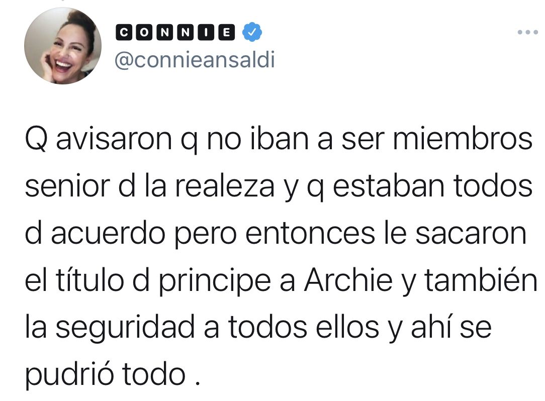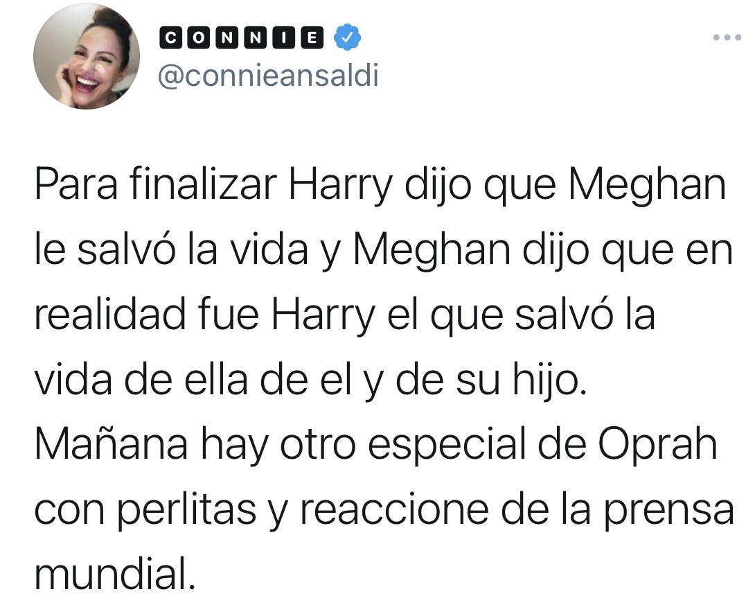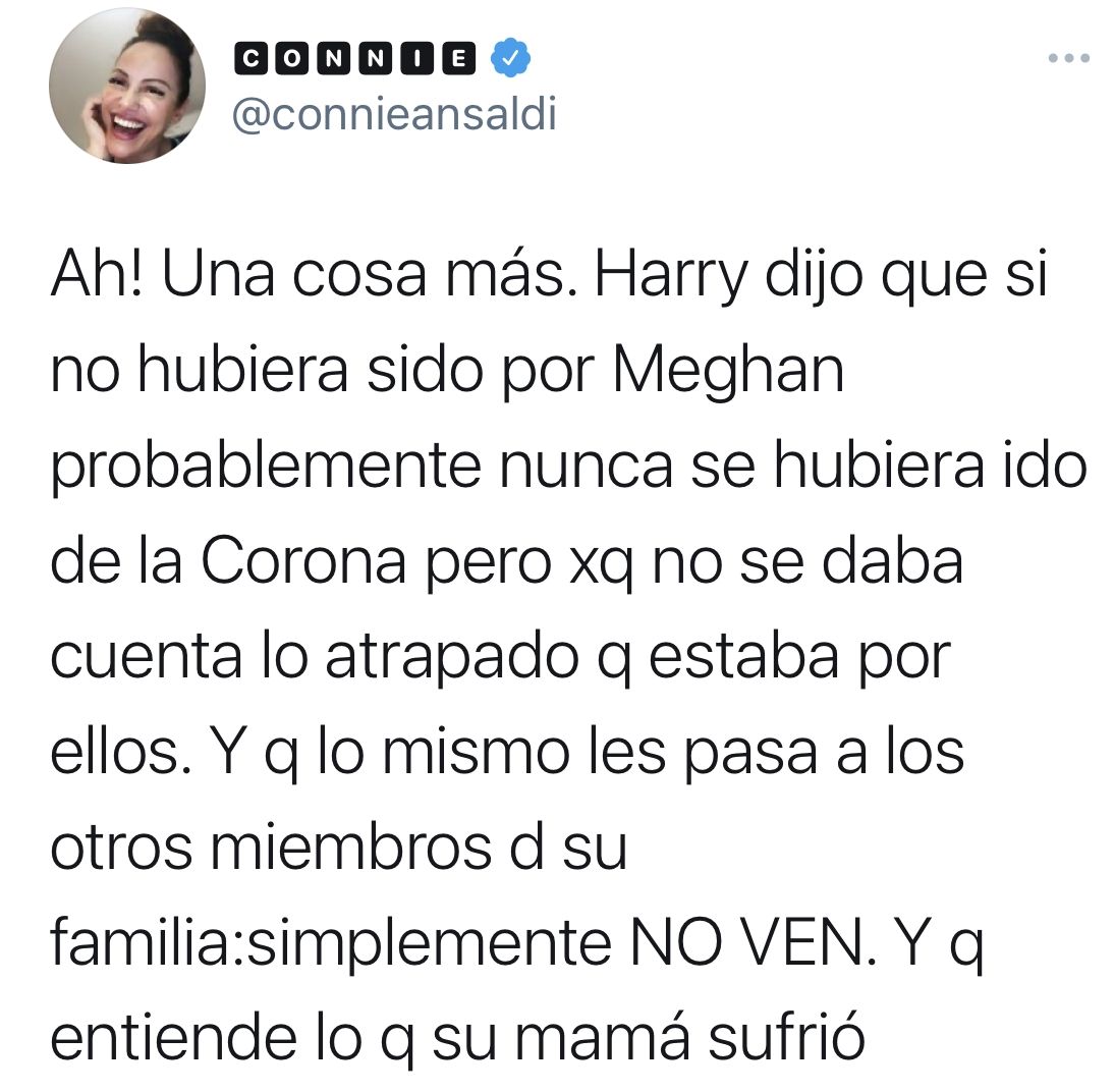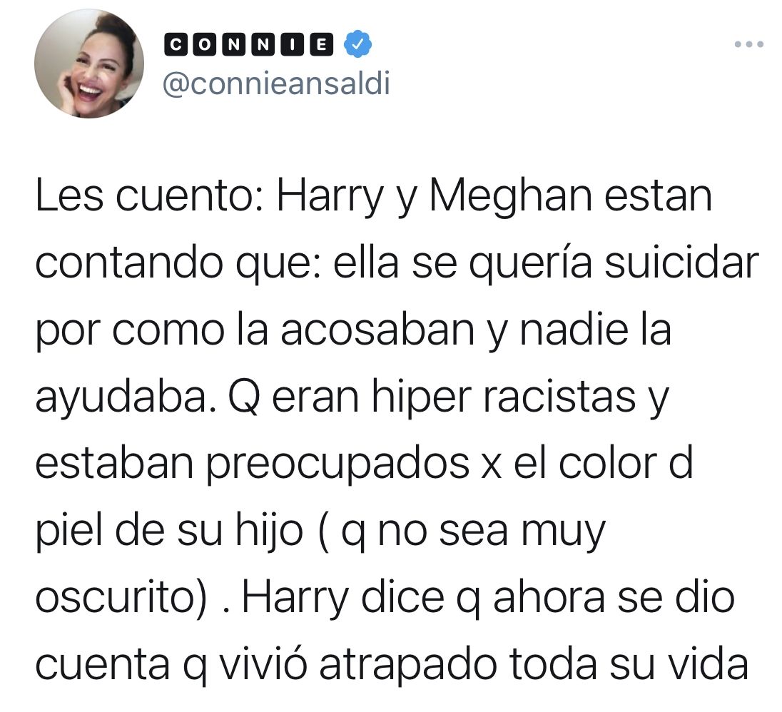 De hecho, Oprah intentó indagar más sobre esa sorprendente revelación de la discusión sobre el color de la piel del niño; pero Harry dijo que no era una conversación que quisiera discutir, y que nunca revelaría con quién la tuvo. Meghan dijo que tuvo un "pensamiento claro, real y aterrador" sobre la posibilidad de contemplar el suicidio mientras era miembro de la familia real. Harry reafirmó que no recibió ningún apoyo de la familia real para cuidar su salud mental.