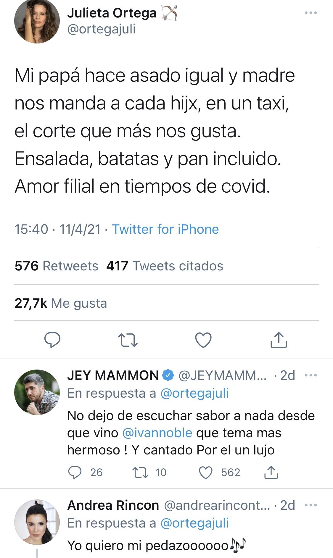 Hubo dos famosos que vieron el mensaje publicado por Julieta y, debido a la amistad que mantienen con ella, contestaron al respecto: Jey Mammon y Andrea Rincón. "No dejo de escuchar sabor a nada desde que vino Iván Noble. ¡Qué tema más hermoso! Y cantado por él, un lujo", dijo Jey. Andrea, quien sigue en carrera como participante de Masterchef Celebrity, fue más fuerte: "¡Yo quiero mi pedazo!".