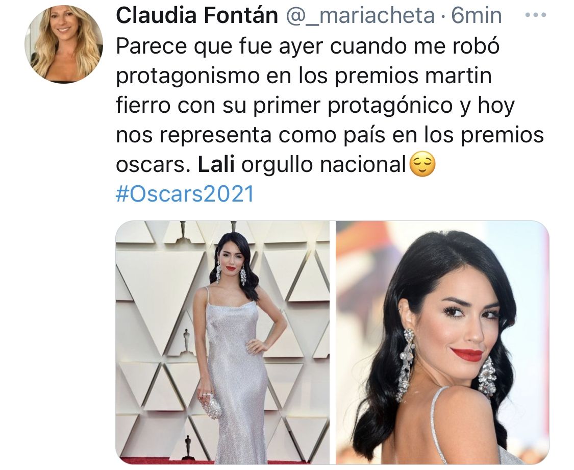 Con una de las poses de Lali en Venecia, se hizo un fotomontaje para conseguir la broma, pues se ha colocado detrás de la artista una imagen de un back de los Oscars 2021. Mirá algunos de los falsos tuits de congratulaciones: