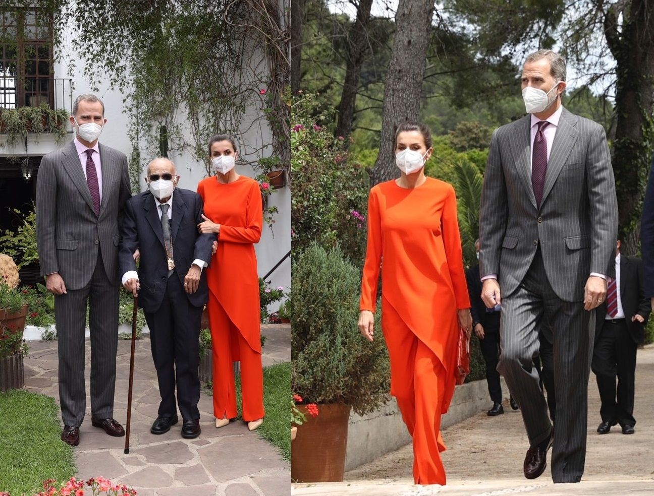La soberana consorte, que asistió junto al rey Felipe VI, volvió a optar por buscar en el fondo del placard y seleccionó un impactante conjunto de blusa larga asimétrica y pantalón acampanado color naranja eléctrico que utilizó para su visita a la Argentina en el año 2019. En los pies, lució delicados estiletos color camel.