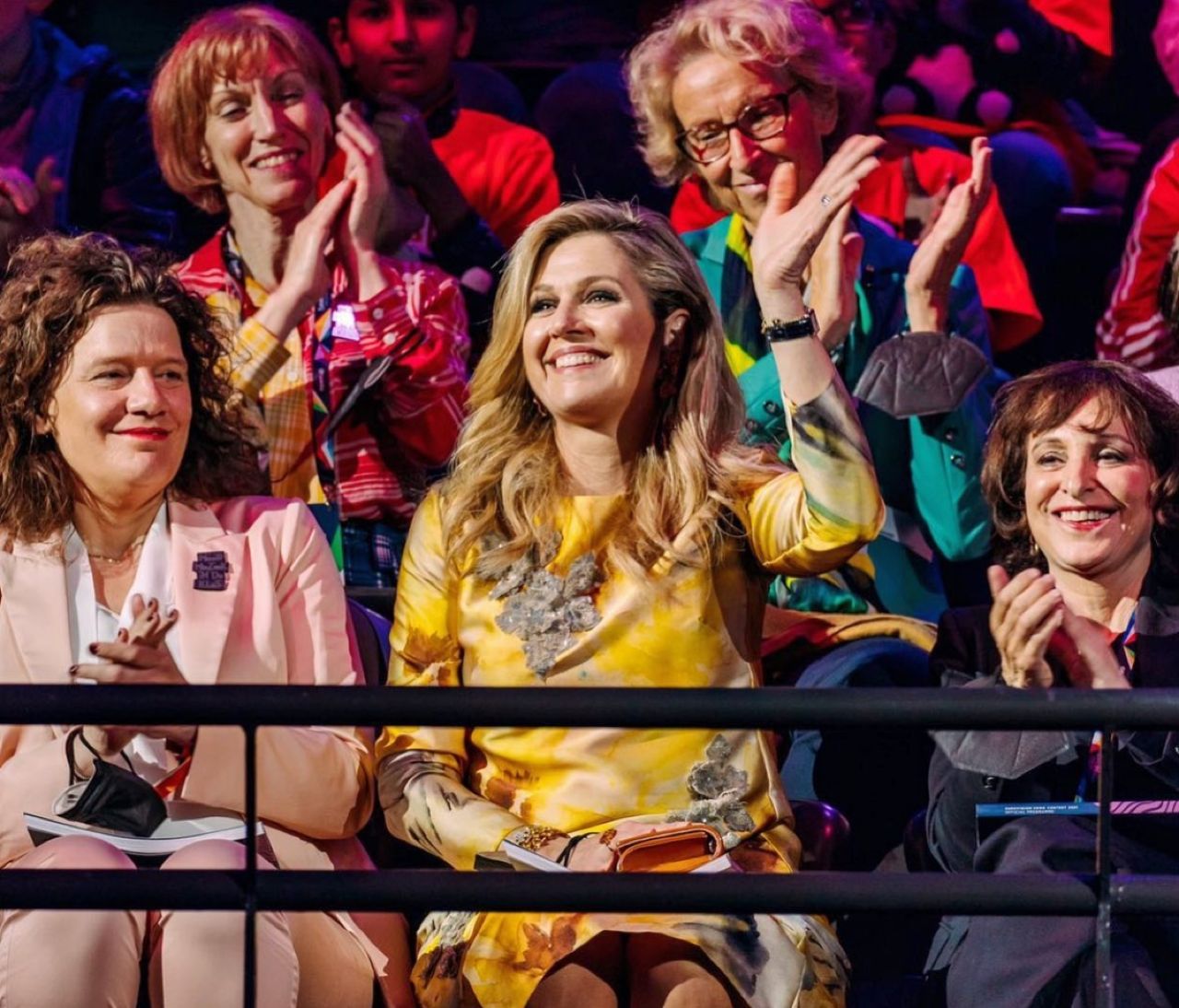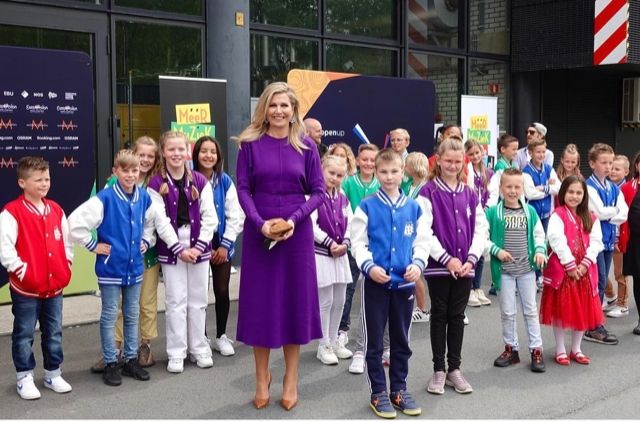 Por la tarde, con 46 estudiantes, disfrutó de los ensayos en el salón de eventos y deportes Rotterdam Ahoy y habló de música con la youtuber transgénero holandesa Nikkie de Jager, una de las presentadoras de Eurovisión de este año. A su llegada, la esposa del soberano holandés fue recibida con una canción, fuera del edificio, por 28 niños y niñas de la Jozefschool en Hoek van Holland, un distrito de Rotterdam.