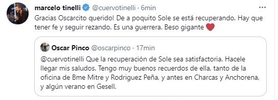 El viernes pasado, en su programa, Marcelo se emocionó al contar cómo fueron los primeros momentos de Soledad luego del transplante. “Quiero mandarle un beso a Sole, sé que me escucha cuando le hablo en terapia intensiva”, expresó.