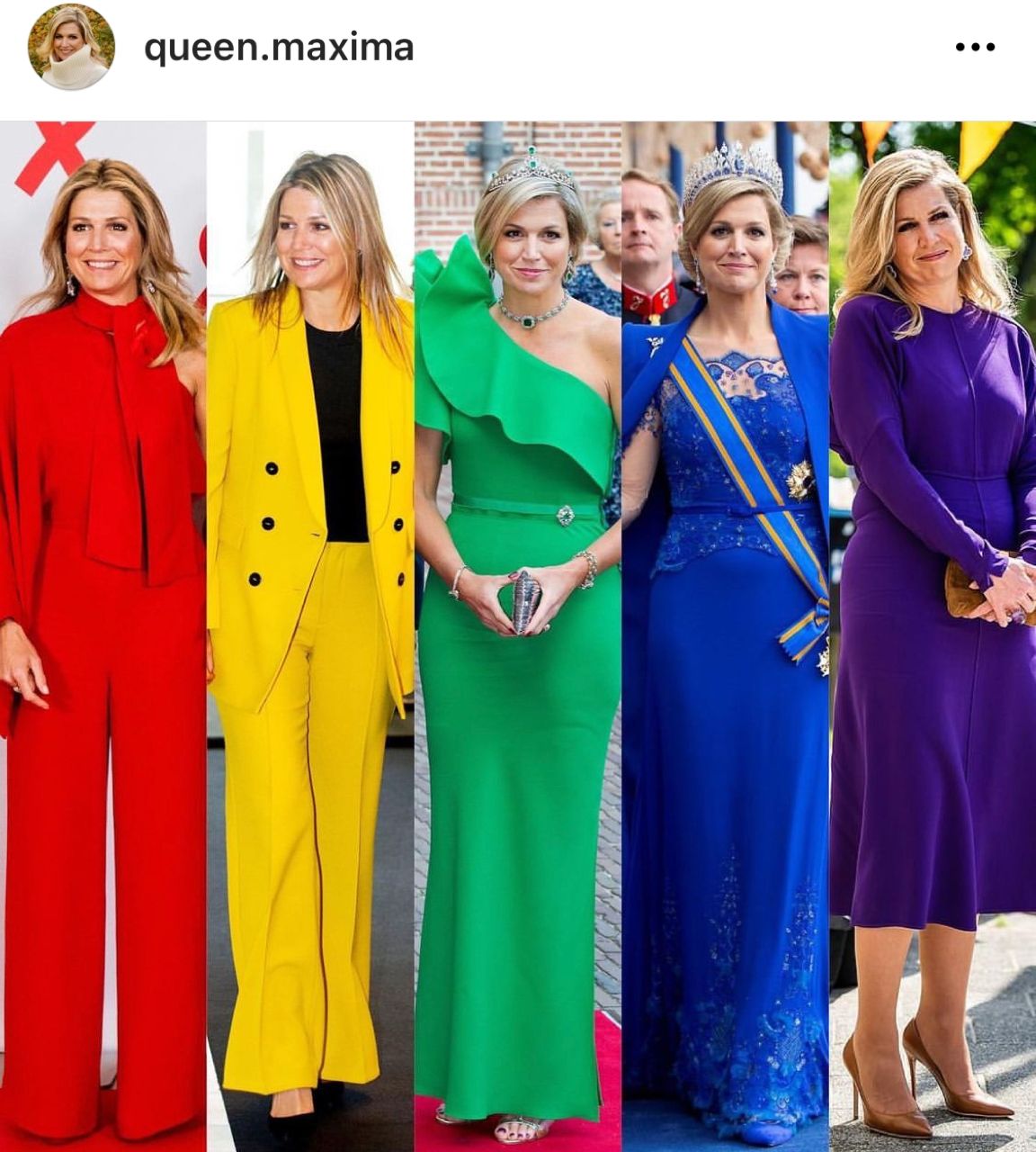 La cuenta de Instagram @queen.maxima, un espacio de esa red social que se ocupa de comunicar novedades sobre la Reina de los Países Bajos, ha sorprendido a sus seguidores con una imagen en donde la argentina figura con distintos looks de diferentes colores, que han sido agrupados para emular la bandera del colectivo.