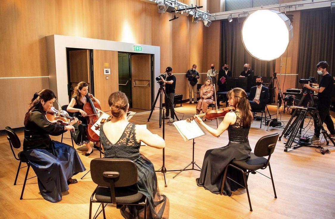 Jovial, descontracturada y siempre interesada; la reina Máxima también asistió a una grabación de un video de un cuarteto de cuerdas y visitó los estudios de música donde conversó con cada persona con la que se encontraba. Los miembros del personal le dieron pormenores sobre la venta de tickets para la próxima temporada. Durante la visita de trabajo también la madre de Amalia, Alexia y Ariane se interiorizó en cuanto a las pautas de aplicación general para combatir el coronavirus.