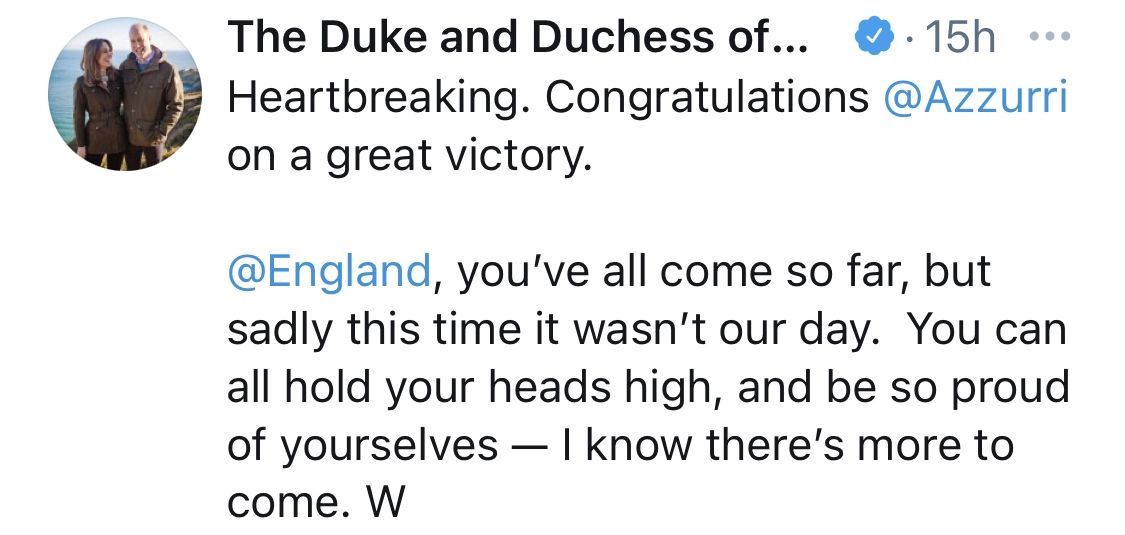 "Desgarrador. Felicitaciones @Azzurri por una gran victoria", escribió en Instagram. "@Inglaterra, has llegado tan lejos, pero lamentablemente esta vez no fue nuestro día. Deben mantener la cabeza en alto y estar muy orgullosos de ustedes mismos, sé que hay más por venir. W", escribió en la red social.