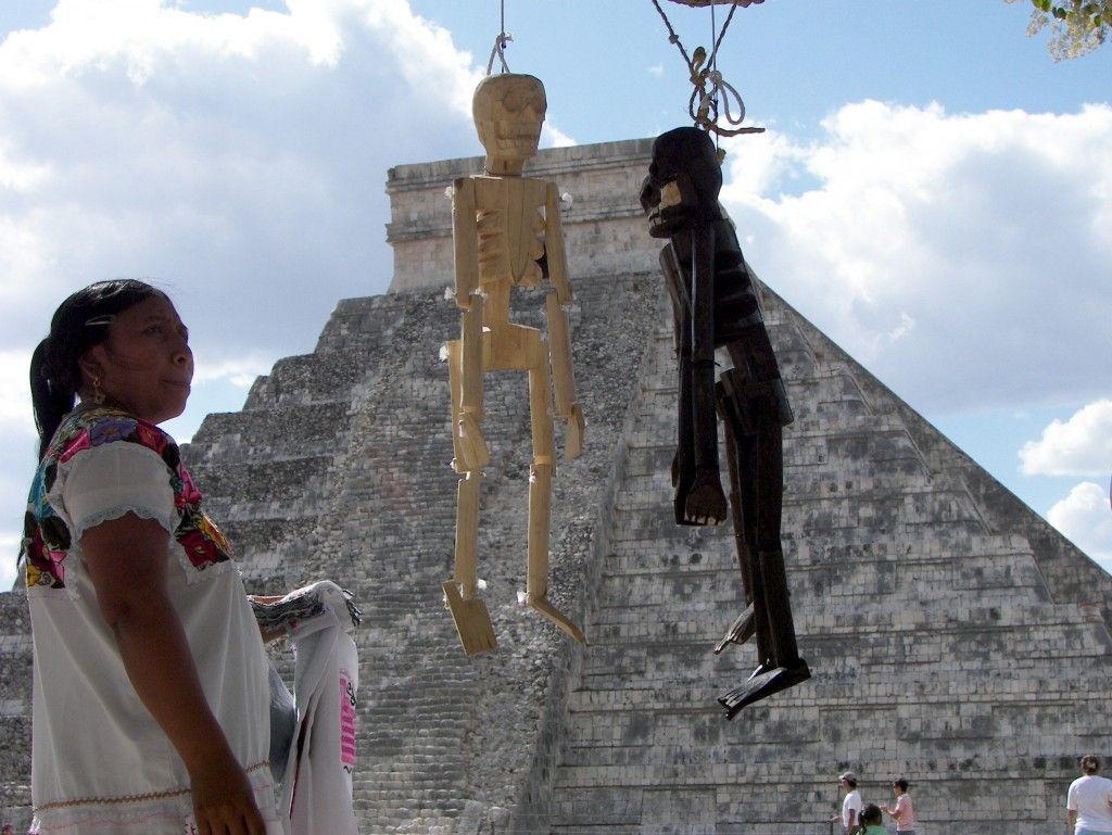 Una tarde más para las calaveritas colgadas del árbol para su venta, en las cercanías de la increíble pirámide de Chichén Itzá, en la península de Yucatán.