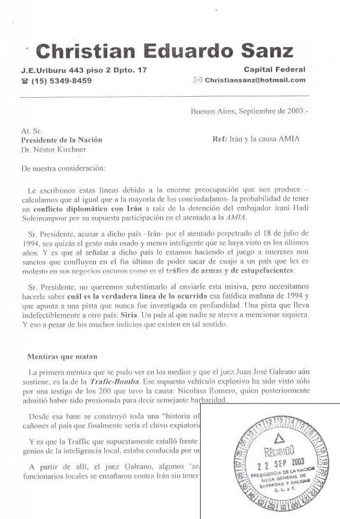 Cuando ello ocurrió, el mismo año que asumió Kirchner, en 2003, junto a otro colega con el que investigué el tema AMIA —y con quien publiqué un libro al respecto— envié dos cartas al entonces mandatario a efectos de ponerlo en autos sobre la verdadera trama.