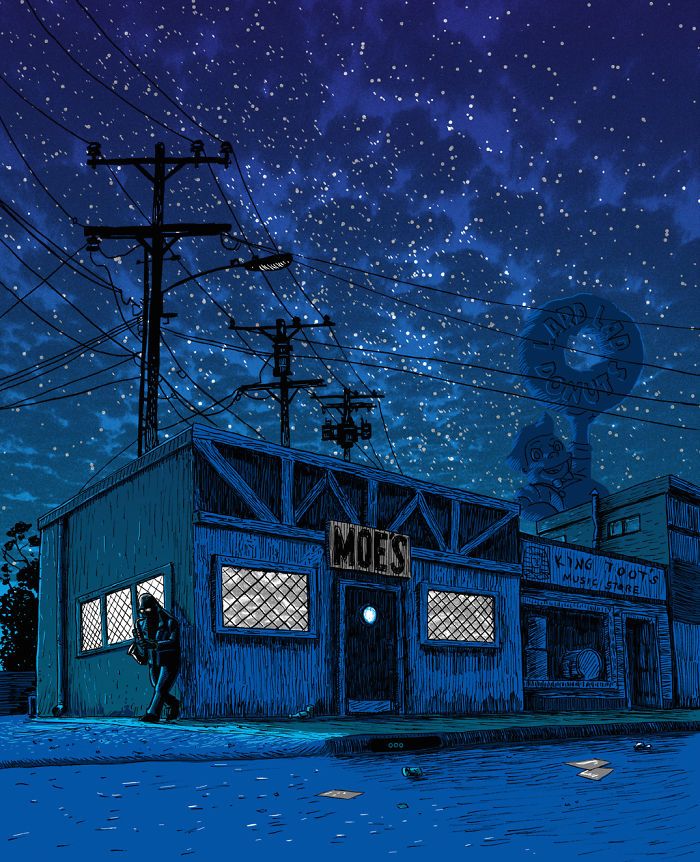 Springfield sin colores, a oscuras, lúgubre, como nunca la viste. Eso es lo que propone el artista plástico e ilustrador Tim Doyle, quien creó una serie de imágenes en las que la ciudad de los Simpson ya no es la de los dibujos animados, sino un sórdido lugar en el que la poca gente que aparece anda entre las sombras.