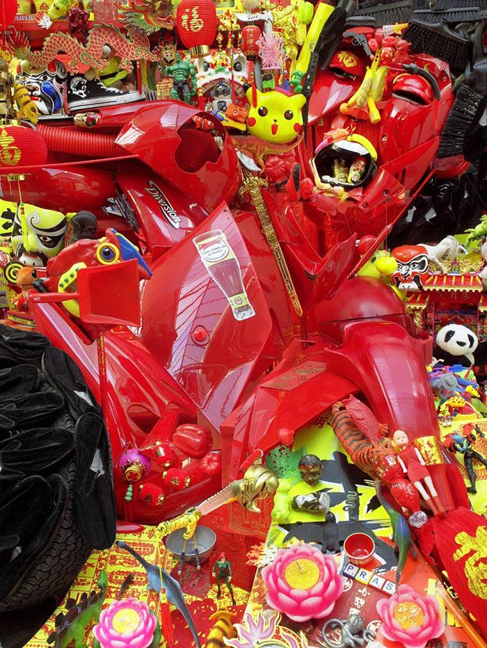 Entre montones de objetos que parecen puestos al azar se esconden imágenes concretas, que es lo que se conoce como arte anamórfico. El cúmulo de elementos agrupados, más allá de la imagen en sí que forman, ofrece una enorme cantidad de detalles gracias a los objetos que lo componen.