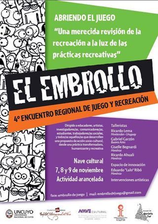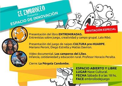 El sábado a partir de las 18, en el marco de El Embrollo 4º Encuentro Regional de Juego y Recreación, se presentará el libro Entremiradas, entrevistas sobre juego, cratividad y campo grupal, además de que se presentarán el juego de naipes Cultura Prehuarpe y el documental Los camperos del Lileo, con un cierre a toda música con La Pérgola Candombe.