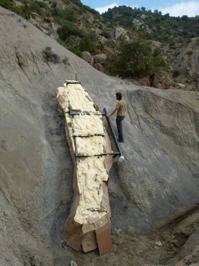 Investigadores del Institut Català de Paleontologia Miquel Crusafont (ICP) y la Universidad de Zaragoza, en España, han extraído en la campaña de excavaciones de este año en el yacimiento de Orcau-‐1 (Lleida) un cuello de saurópodo de más de 5 metros de longitud. La estructura fabricada para sacar intacto el fósil que los paleontólogos llaman "momia" pesaba unos 2.500 kilos. La operación de extracción y traslado fue todo un éxito a pesar de las grandes dimensiones y peso de la pieza. El estudio de este fósil único aportará nuevas informaciones sobre los dinosaurios saurópodos que vivieron en el Pirineo antes de su extinción.