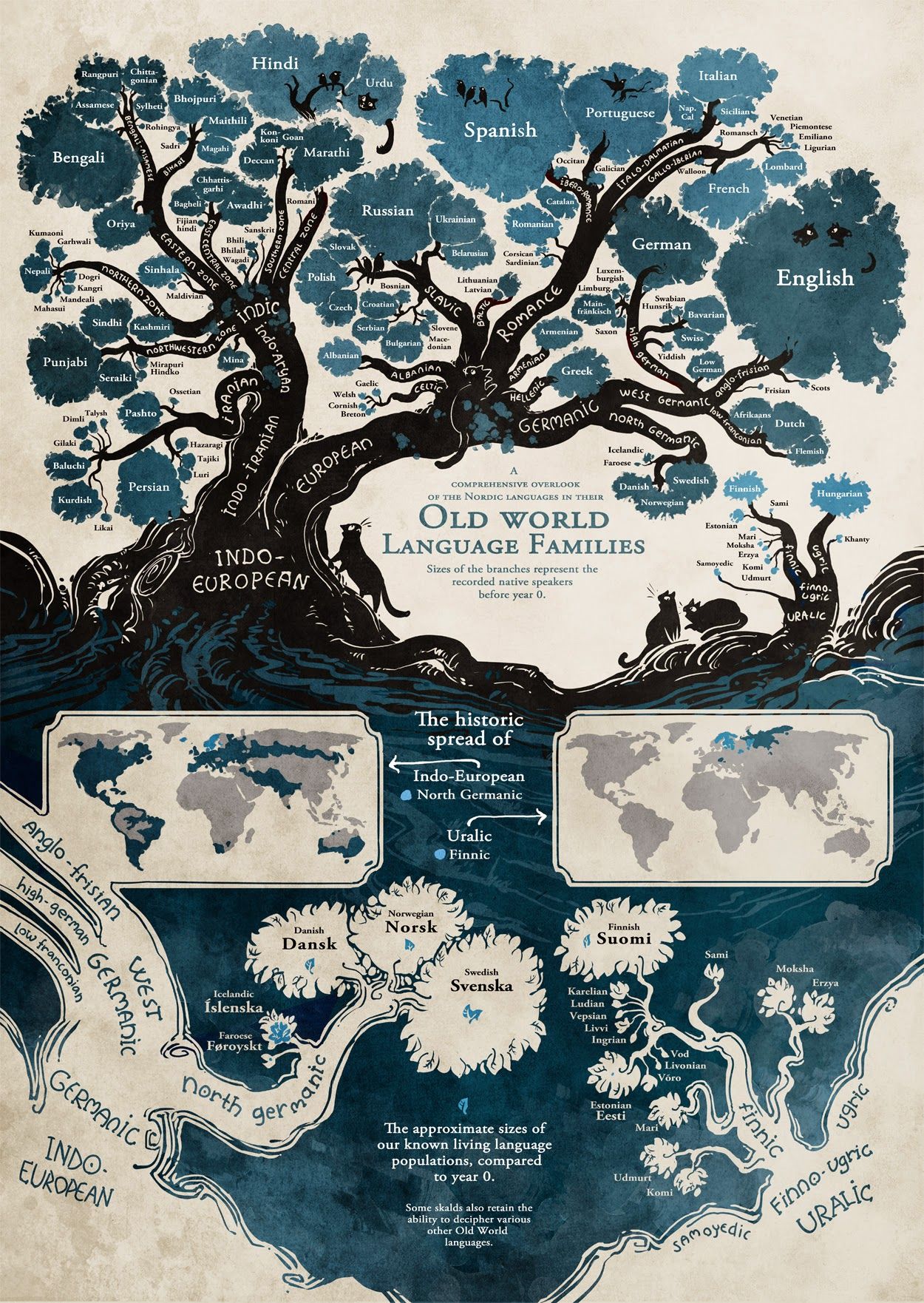 El dibujante de cómics Minna Sundberg elaboró un complejo pero muy ilustrativo árbol genealógico de los idiomas indoeuropeos y de los Urales.