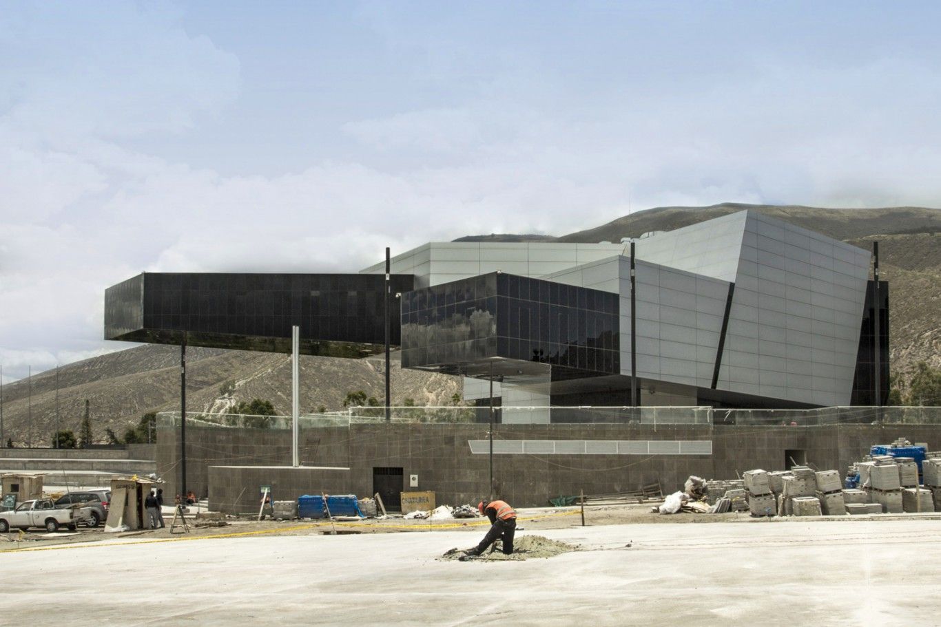 El edificio fue diseñado por Diego Gauyasamín, sobrino de Oswaldo, y en la parte exterior sobresalen las estructuras voladas, que se imponen con sus 50, 38 y 8 metros de longitud, lo que las convierte en las mayores en América del Sur. Estas estructuras voladas se sostienen mediante sofisticados sistemas de anclaje y tensores.
