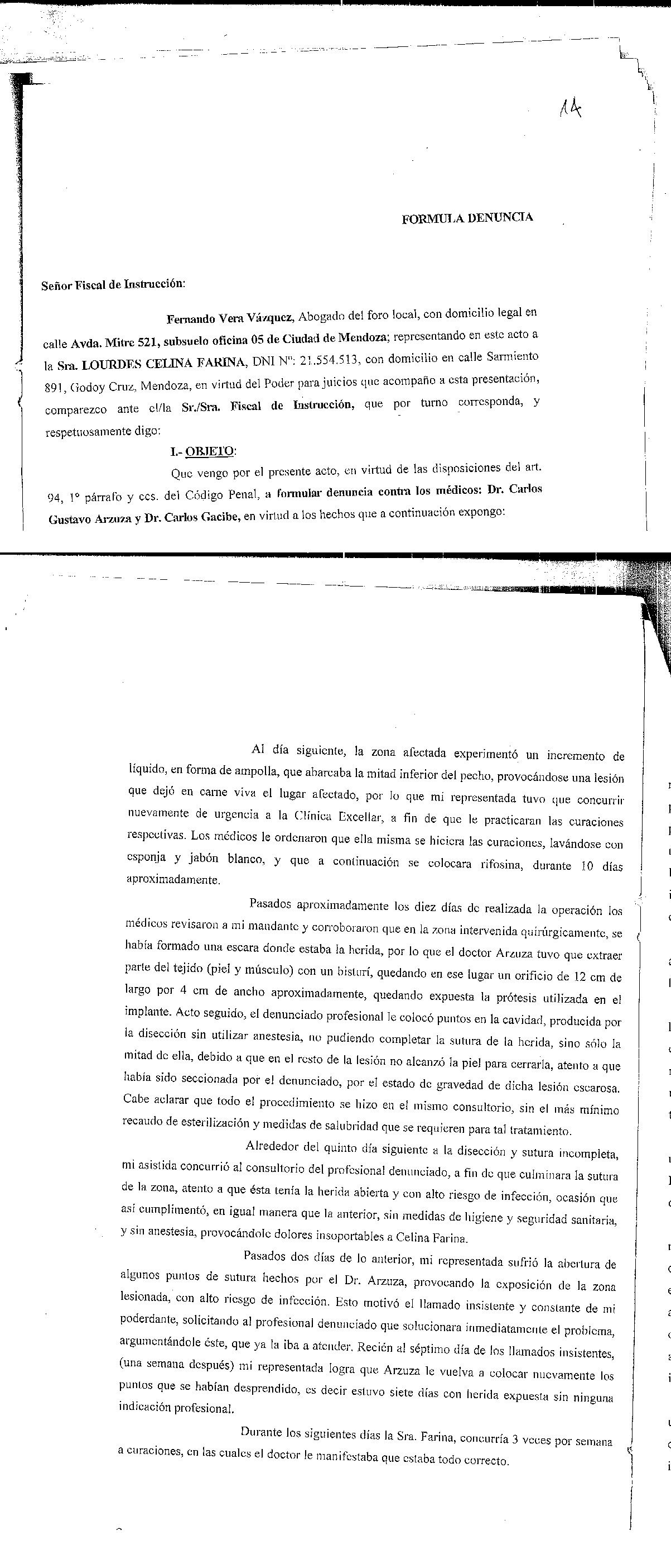 Farina concurrió con el doctor a colocarse un implante mamario pero terminó con una infección, asistencia psicológica y medio pecho menos, que debió ser amputado por la intervención mal realizada. "Fui muy perjudicada, me fue mal", dijo aún conmovida la mujer a MDZ.