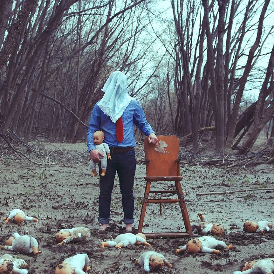 Los cuerpos fraccionados y los rostros sugeridos tras lienzos que dejan traslucir el terror son una fascinación de este fotógrafo que, a partir de una impecable edición digital, consigue imágenes paradójicamente bellas del horror.