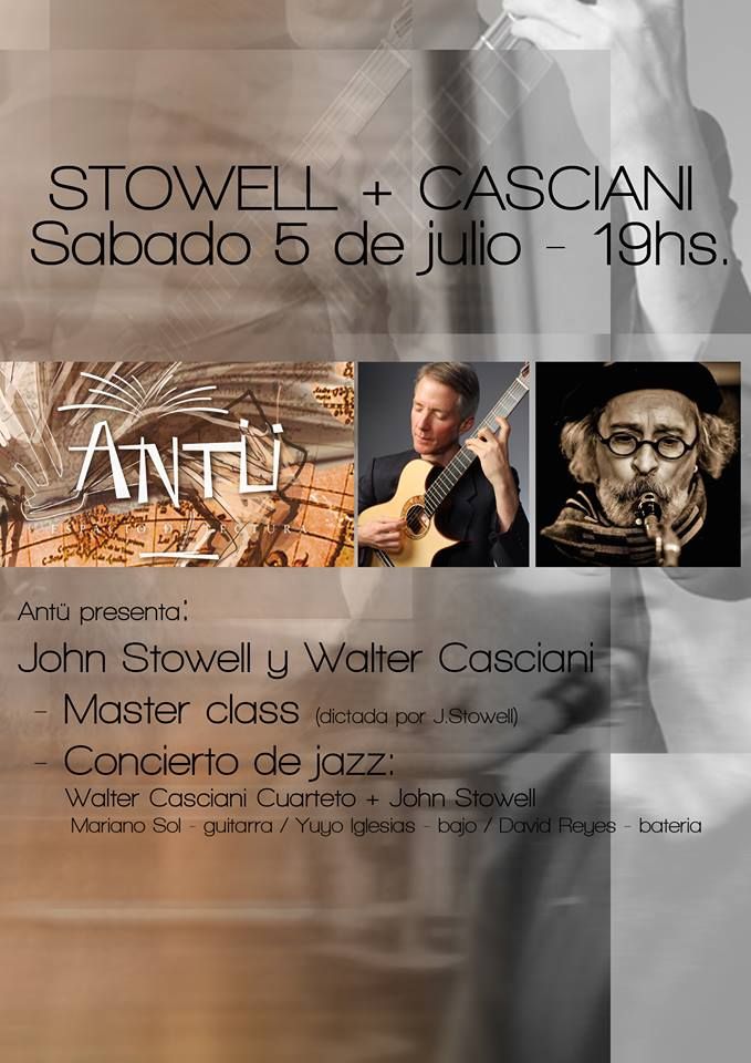 Una fantástica jornada de jazz es la que se podrá vivir el sábado 5 de julio desde las 19 en Antü Espacio de Lectura (La Barraca Mall, Las Cañas 1833, Local 26/27, Dorrego). El programa es una joyita, tanto para los amantes del jazz como para los músicos. Y es que, en primer término, el guitarrista Jon Stowell dará una master class; después, Walter Casciani Cuarteto dará un concierto, y como cierre, Jon Stowell y Walter Casciani Cuarteto se unirán para dar un cierre de lujo.