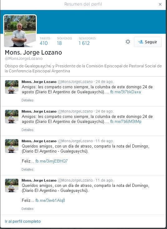El obispo con más seguidores es monseñor Lozano, con 1.593; le siguen monseñor Fernández, con 679; monseñor Torrado Mosconi, con 463; monseñor Vázquez, con 214, y monseñor Garlatti con 92, cierra la lista el recién llegado monseñor Ojea, con 49 seguidores.