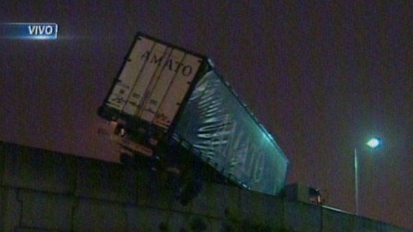 Un camión quedó esta mañana con la mitad de su semirremolque colgado de las barreras de contención de la bajada de la autopista Camino Negro, a la altura de la localidad bonaerense de Banfield, al esquivar a un indigente que se había recostado en la calzada.