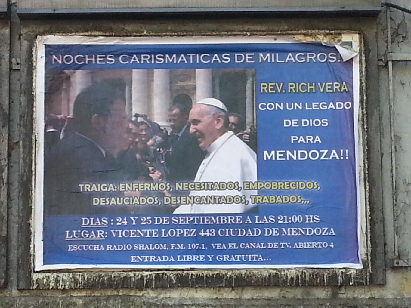 Se llama "Reverendo Rich Vera" y unos carteles con lo que parece ser su imagen junto a Bergoglio invitó a irlo a ver en nuestra provincia. "Traiga empobrecidos".