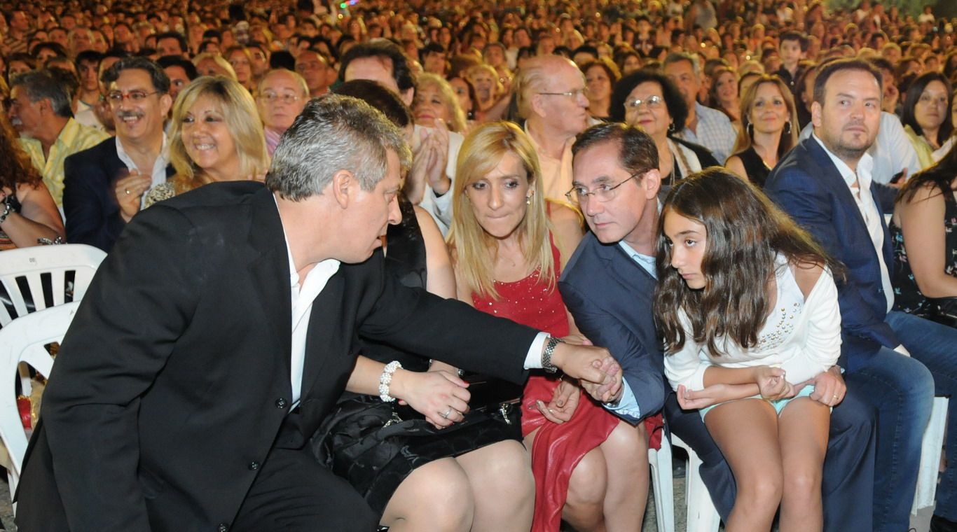 El paso de las horas -se preveía que la fiesta arrancara a las 21- dejó entrever que el choque de copas se extendió porque con cierto retraso, alrededor de las 23.15, el jefe comunal arribó al predio del Parque Agnesi acompañado por Marcelo Costa (Agroindustria), Javier Espina (Turismo), Marizul Ibáñez (Cultura) y Jorge Tanús (presidente de la Cámara de Diputados). Los azules, Giménez y Tanús, se estrechan las manos a minutos de comenzar la fiesta.