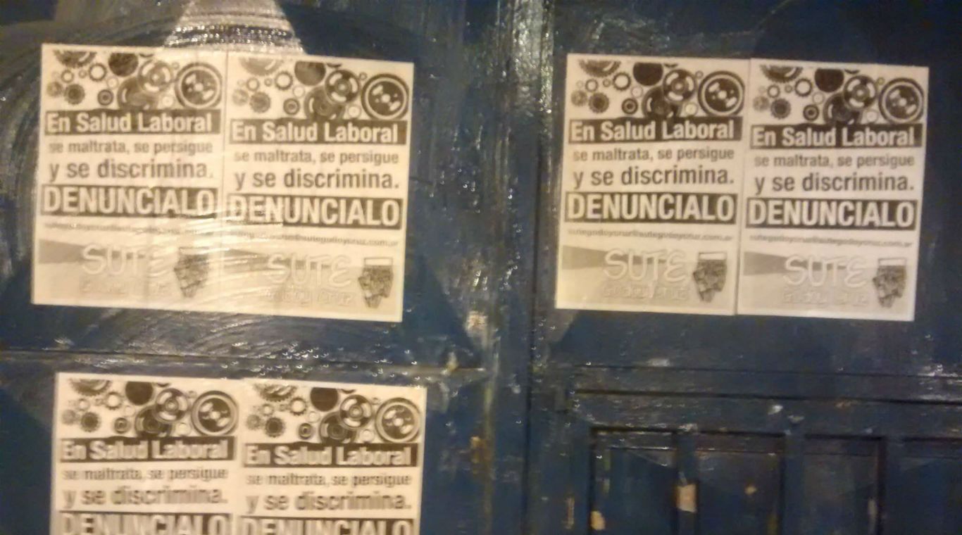 "En Salud Laboral se maltrata, se persigue y se discrimina. Denuncialo", rezaba la leyenda de los carteles que fueron pegados días atrás por integrantes del SUTE Godoy Cruz en el frente de ese organismo del Estado, en la calle San Juan de Ciudad, responsable de otorgar los certificados de aptitud a los docentes.